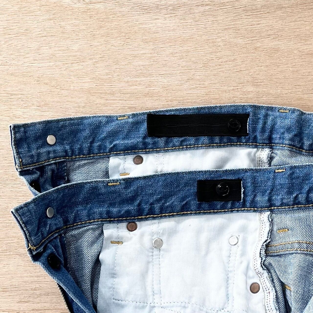 サイズ調節可能なウエストボタンホールゴム仕様にし、ベルトなしでもサイズ調節可能に。