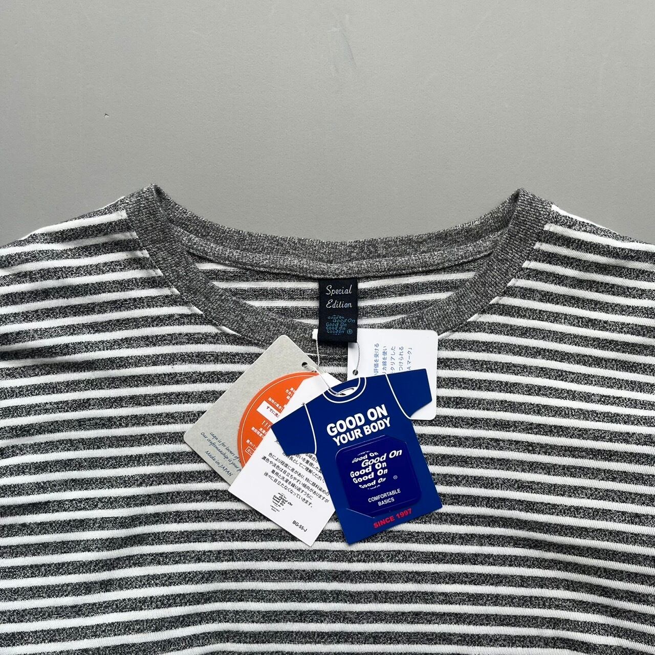 定番で人気の丸首Tシャツと同型のボーダーTシャツができました。仕立ては男らしく、シルエットは女性らしく。 Good.onによる、アメリカ製の素材、くり返し洗っても型崩れしない丈夫な縫製と、caquによる女性らしいパターンメイクがドッキング。 男っぽいのに女っぽい、caquらしいT-shirtsになっています。