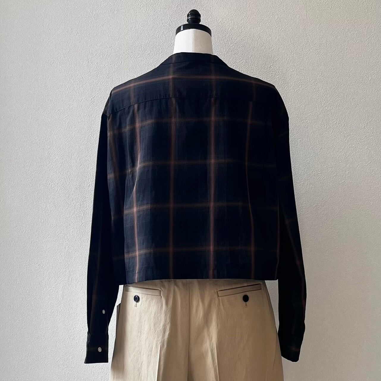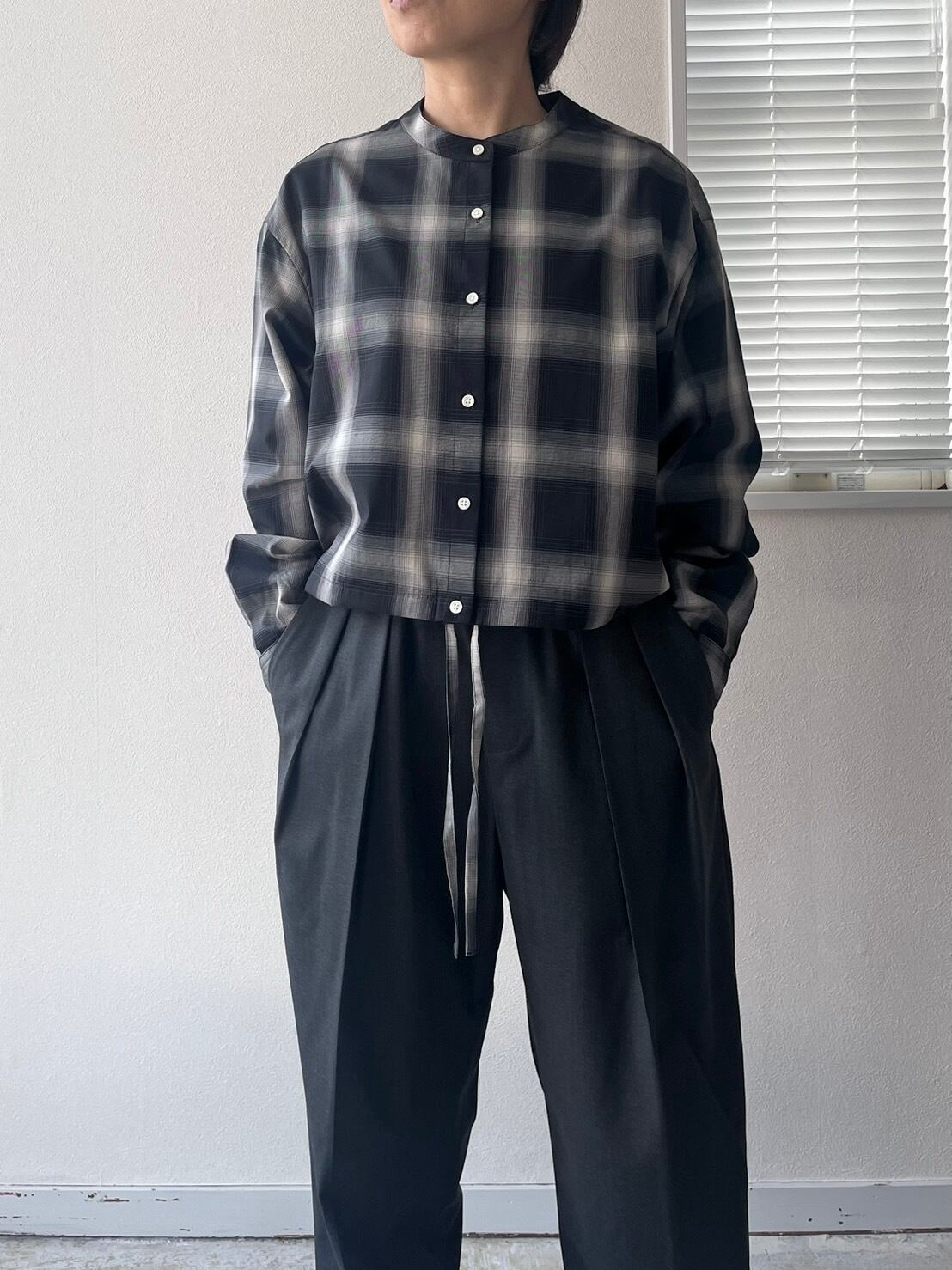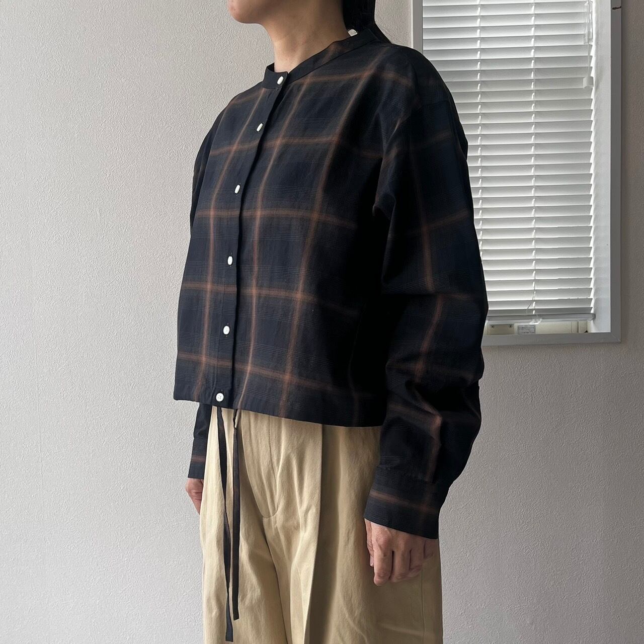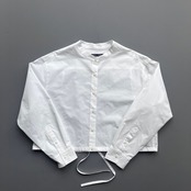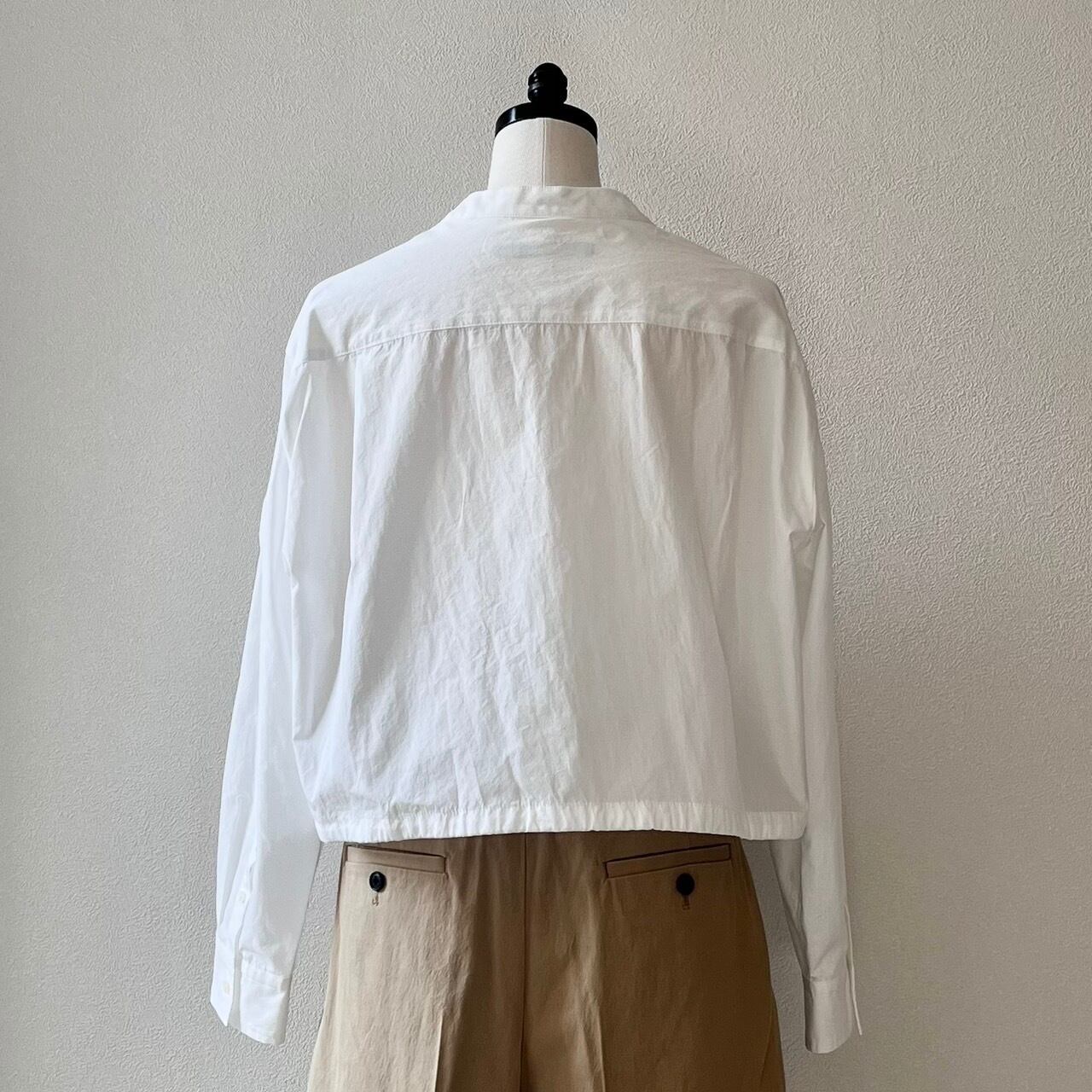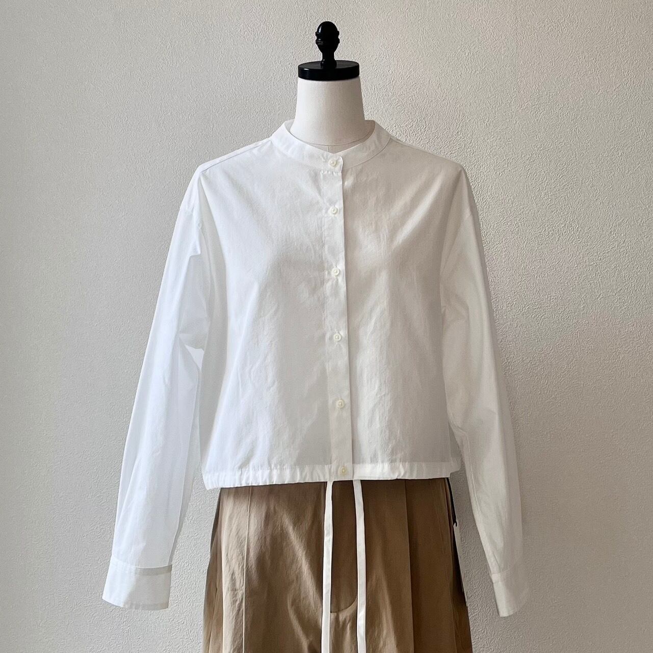 ショートレングスのゆとりあるフィット感を裾部分のドローストリングを絞ったり、伸ばしたりして着回しを楽しめる定番ブラウスMARYのアップデート。ワイドなボトムと合わせて、シャツとして、また羽織としてのスタイリングをお楽しみ下さい。