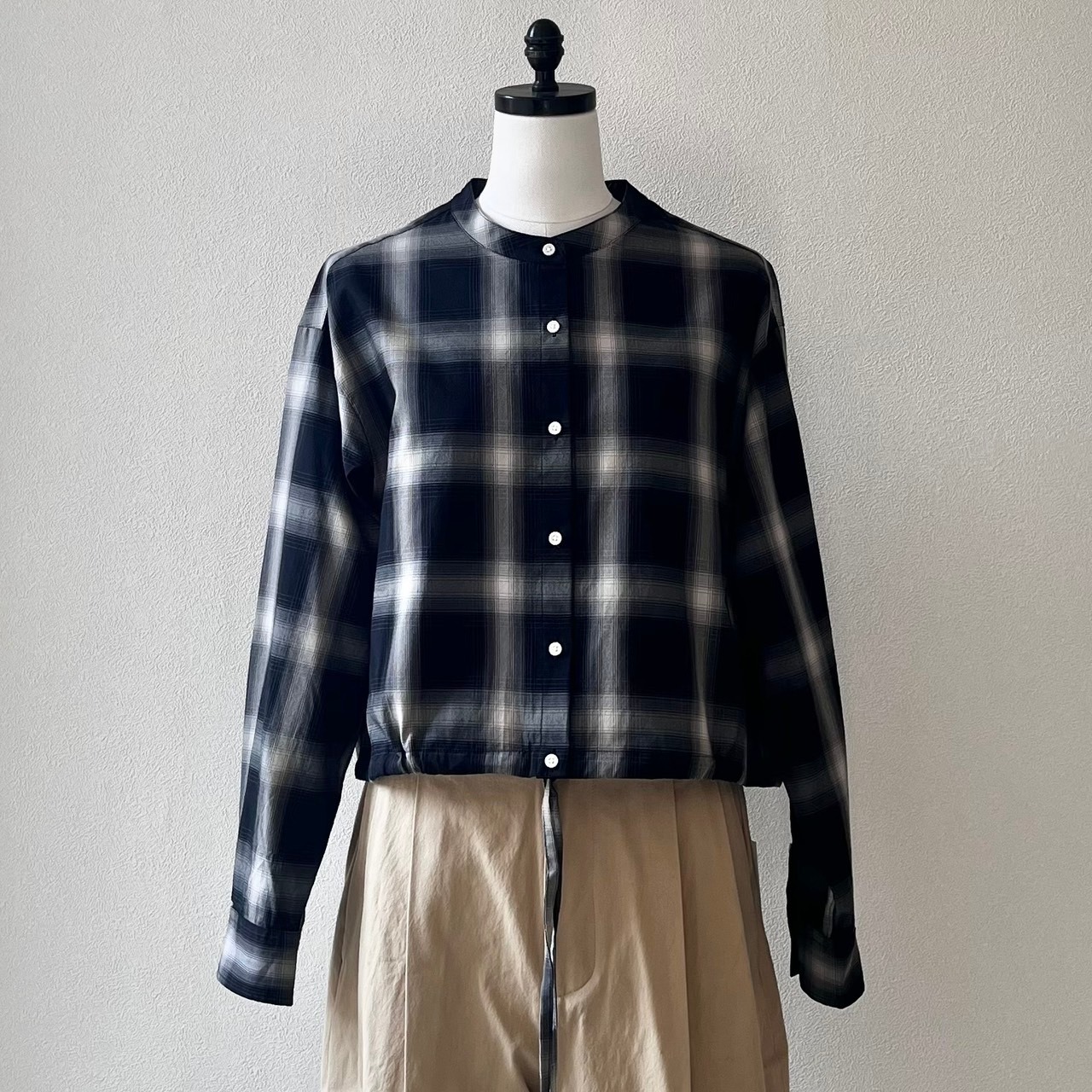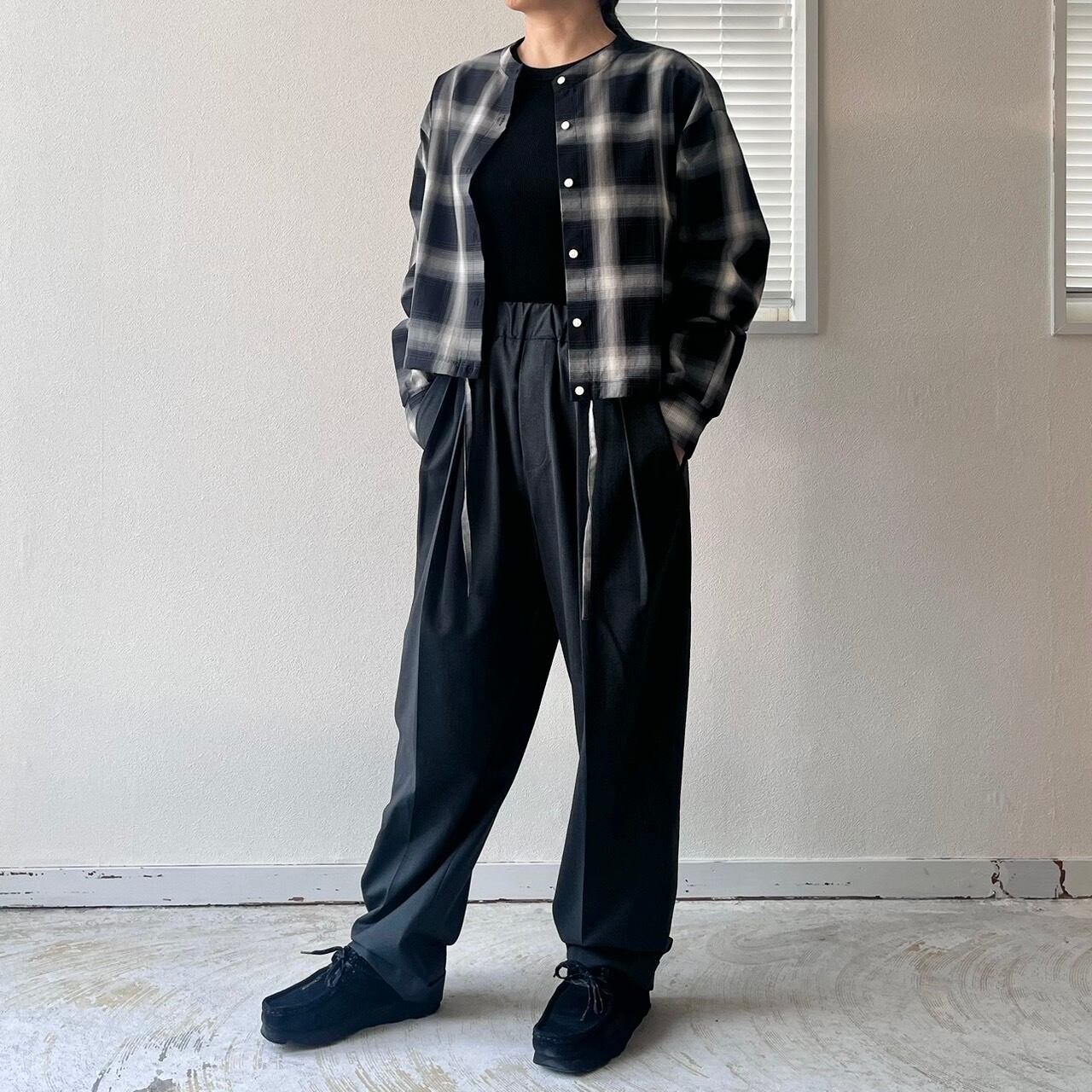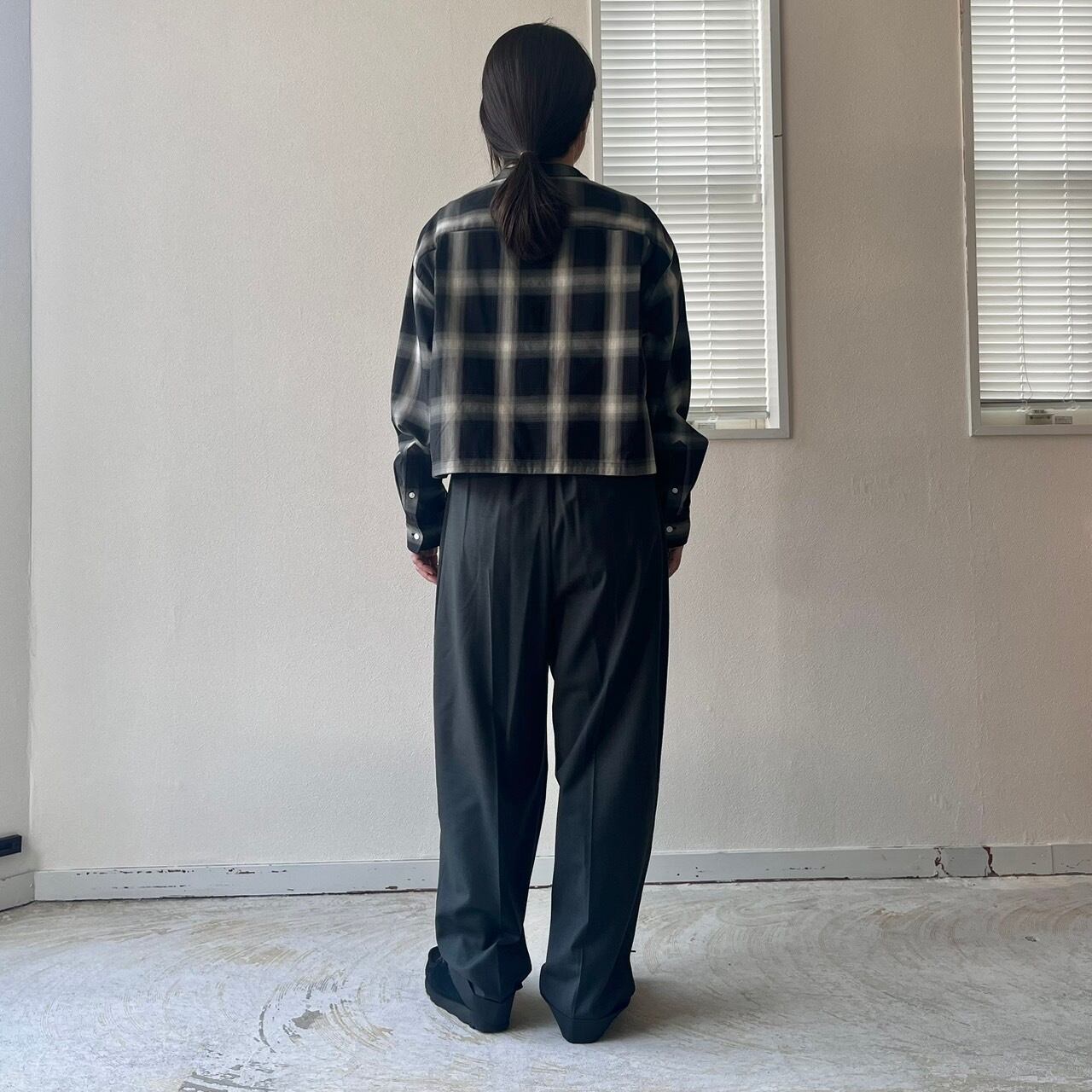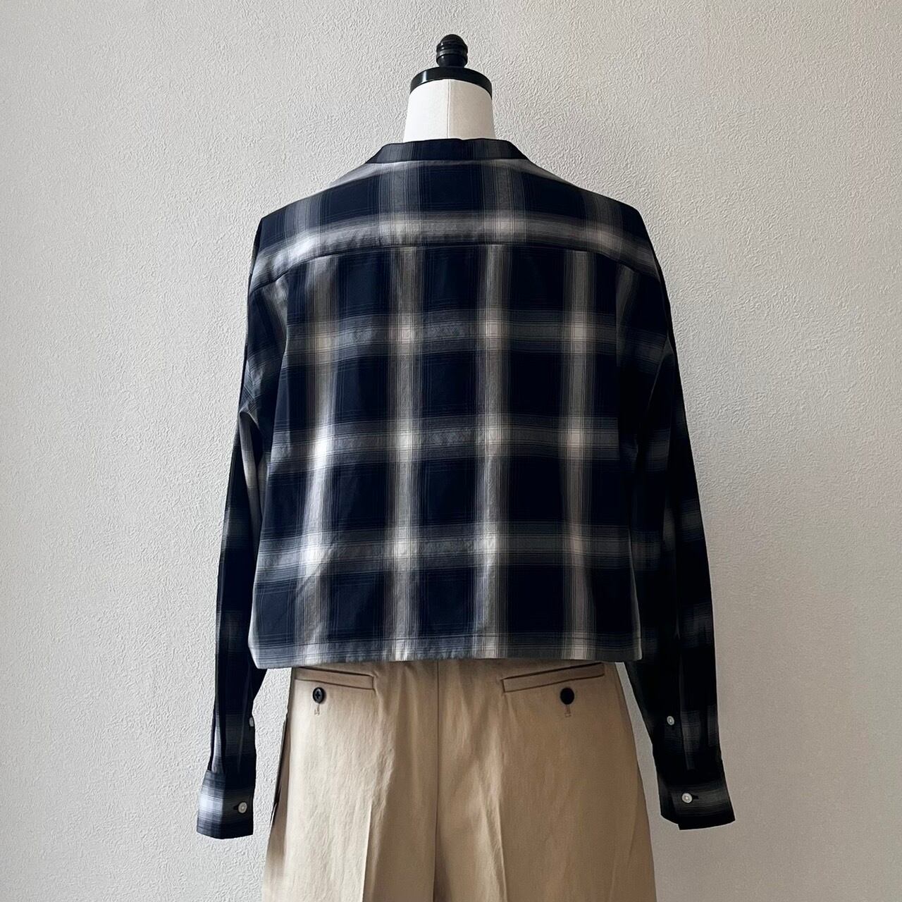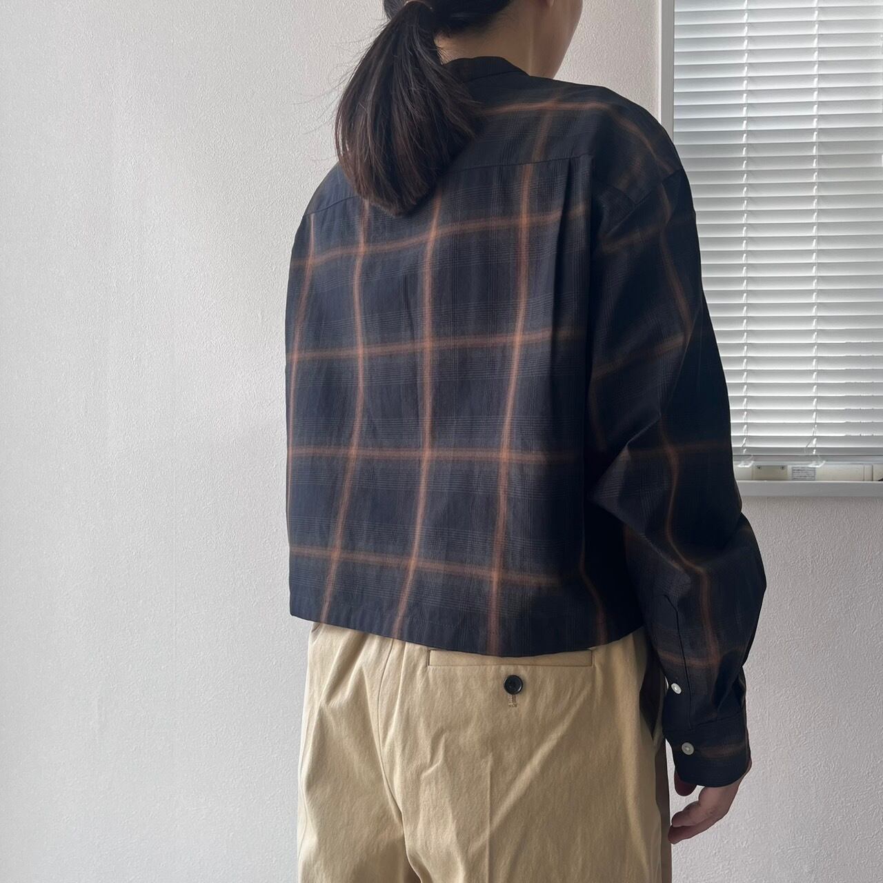ショートレングスのゆとりあるフィット感を裾部分のドローストリングを絞ったり、伸ばしたりして着回しを楽しめる定番ブラウスMARYのアップデート。ワイドなボトムと合わせて、シャツとして、また羽織としてのスタイリングをお楽しみ下さい。
