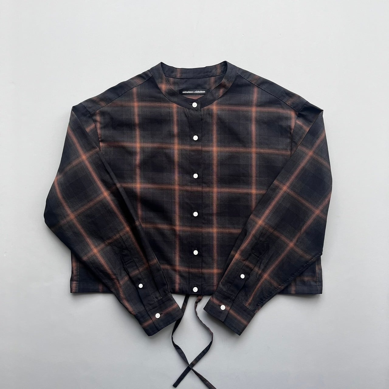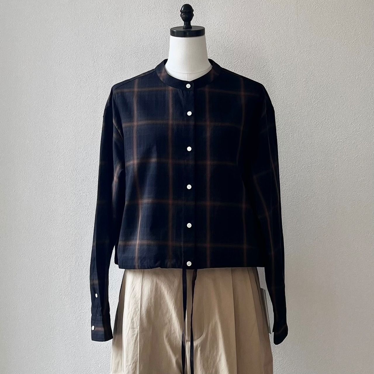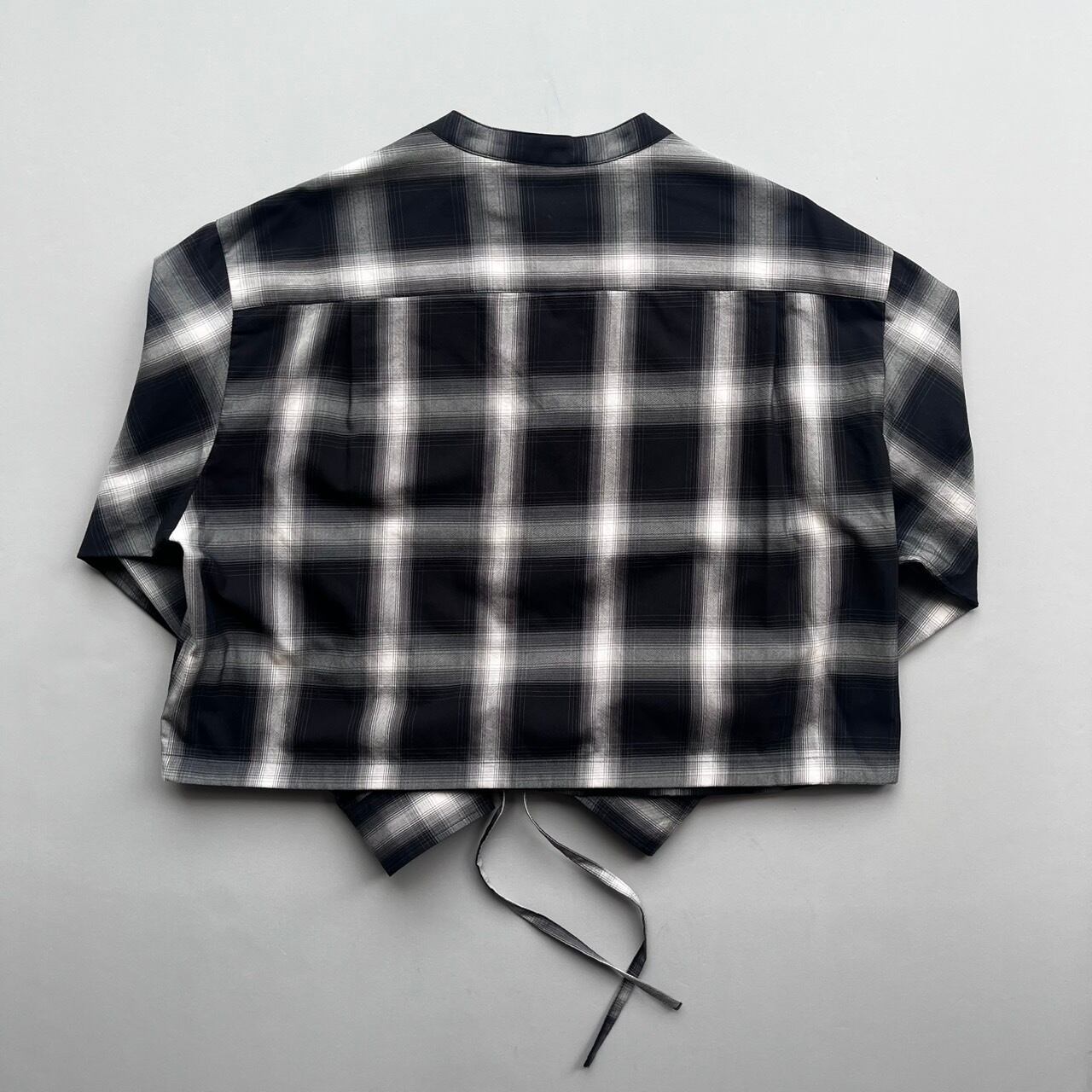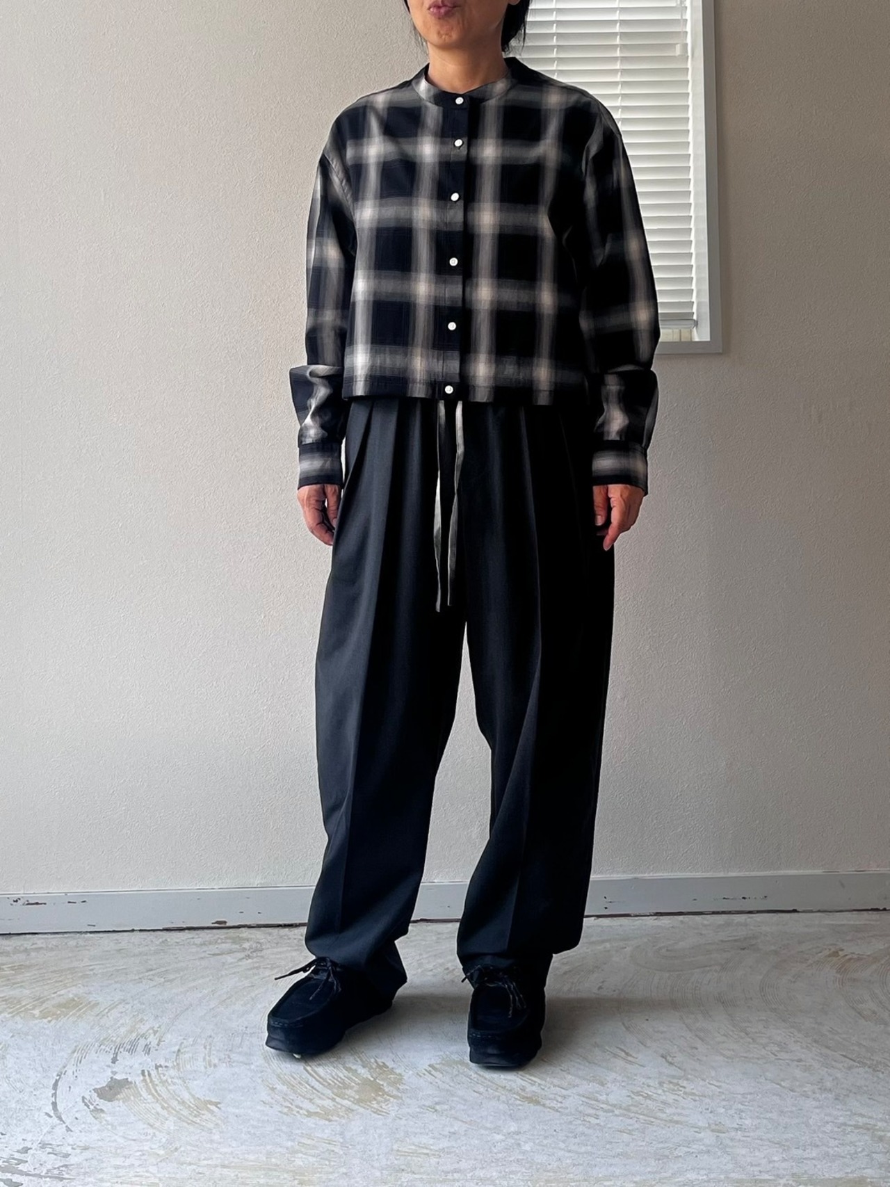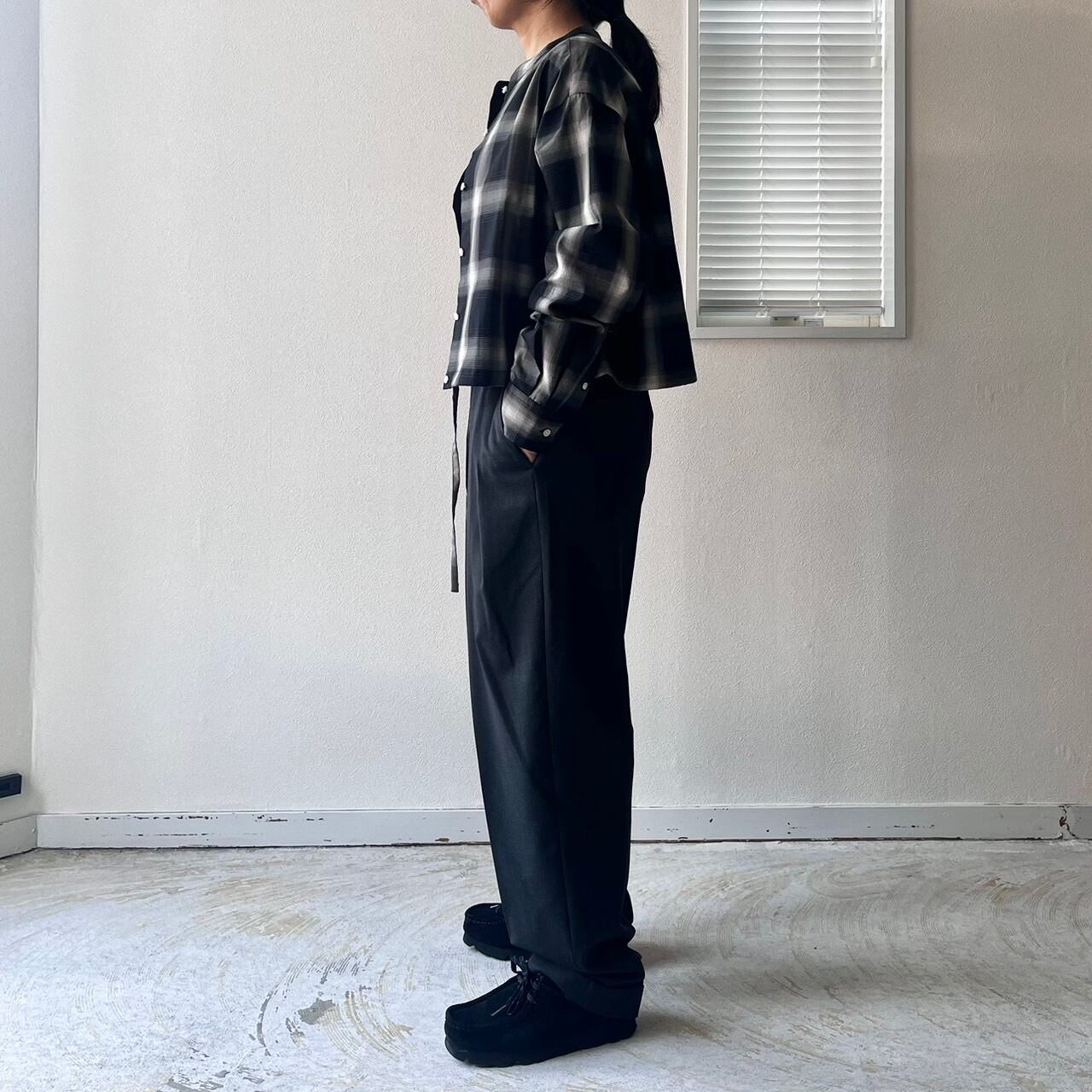 ショートレングスのゆとりあるフィット感を裾部分のドローストリングを絞ったり、伸ばしたりして着回しを楽しめる定番ブラウスMARYのアップデート。ワイドなボトムと合わせて、シャツとして、また羽織としてのスタイリングをお楽しみ下さい。