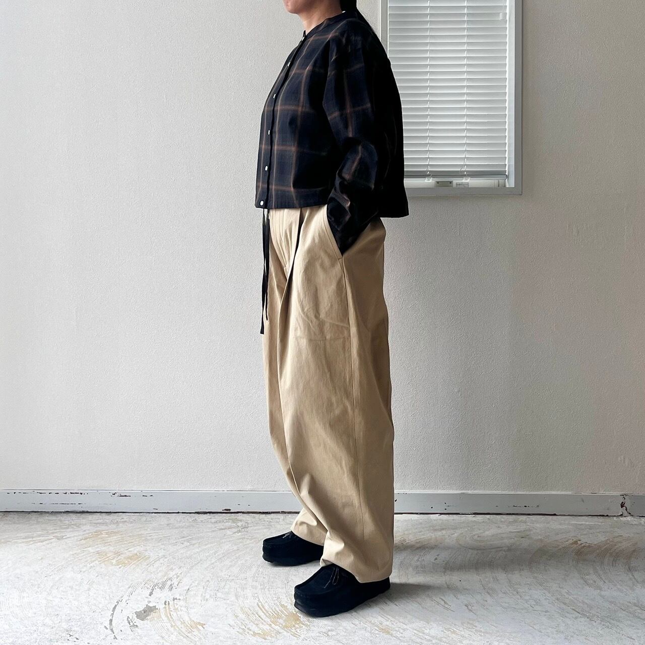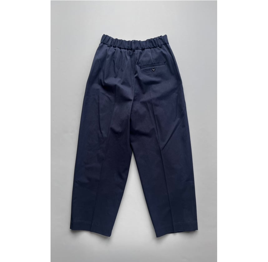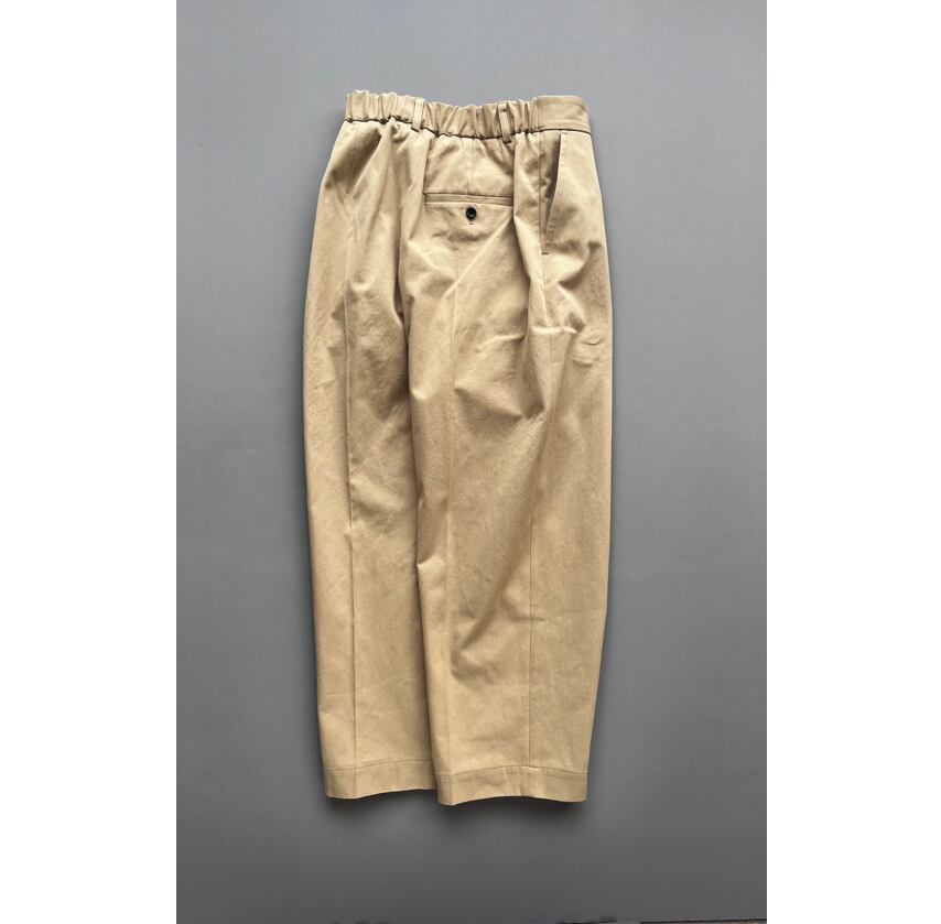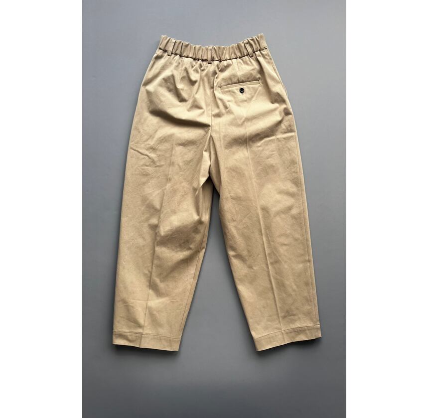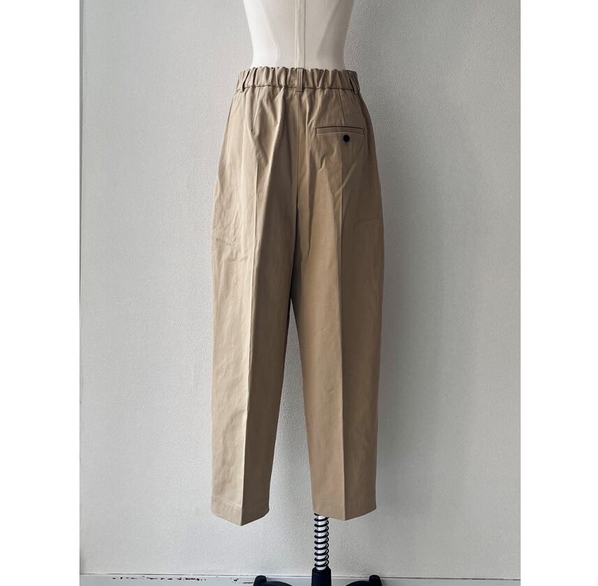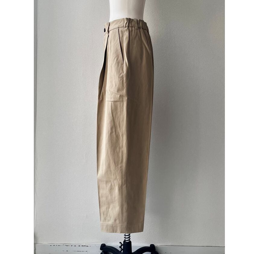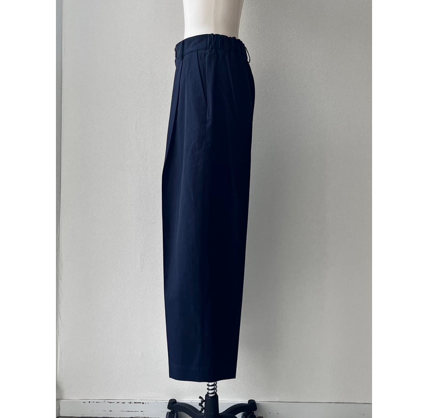 ワンタックのバーレルシルエットのパンツ。美しいワイドレッグのフルレングスが大人のコーディネイトを演出します。後ウエスト部分にはシャーリングゴムを使用しフィッティングをサポート。