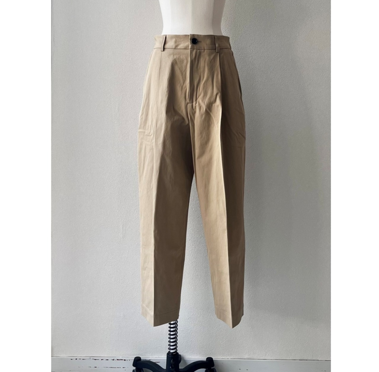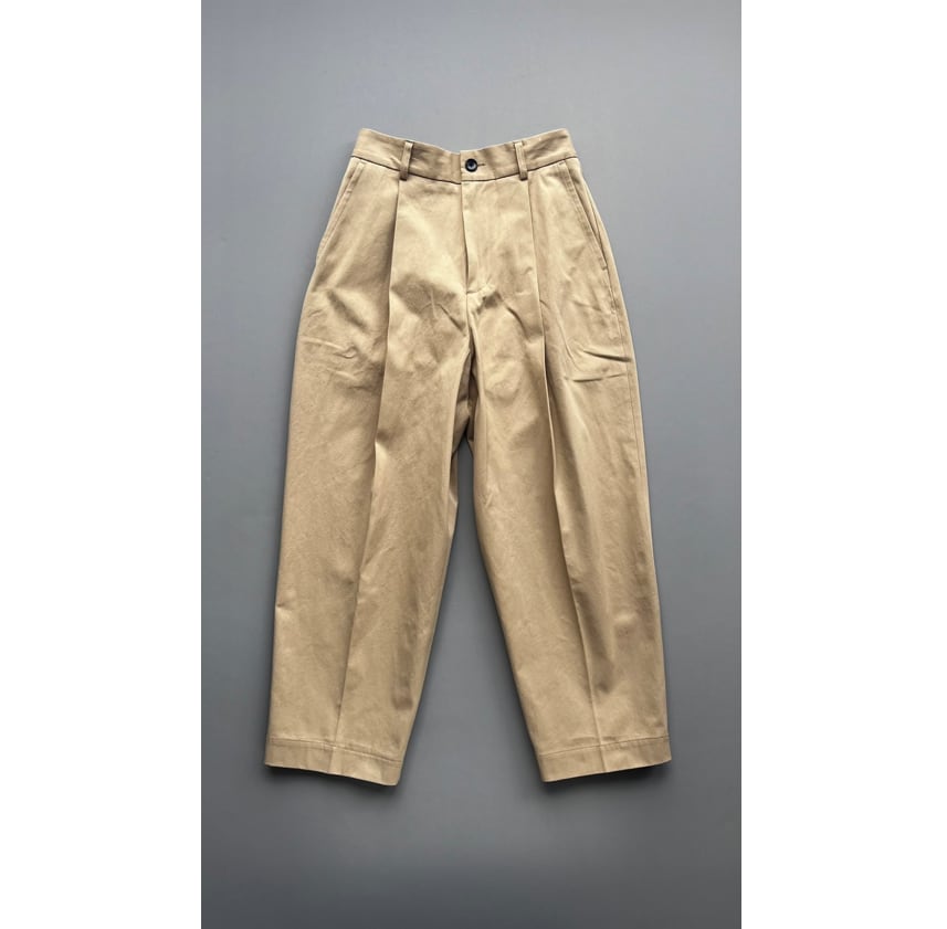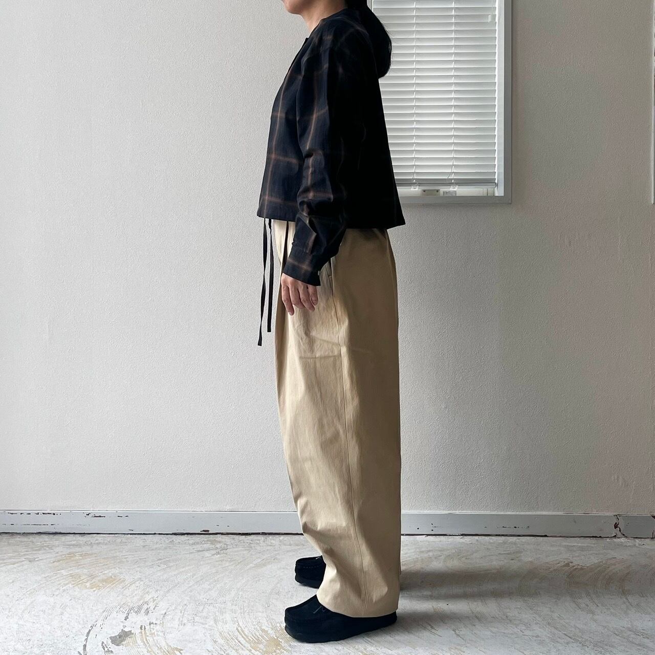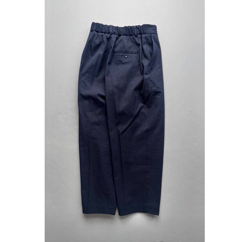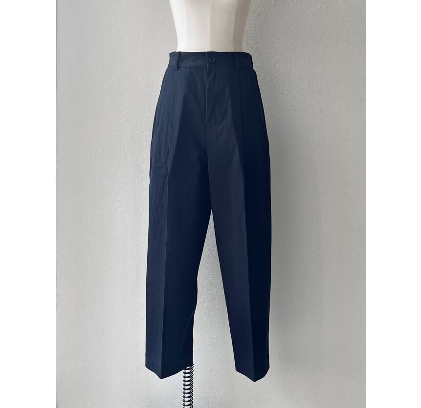 ワンタックのバーレルシルエットのパンツ。美しいワイドレッグのフルレングスが大人のコーディネイトを演出します。後ウエスト部分にはシャーリングゴムを使用しフィッティングをサポート。