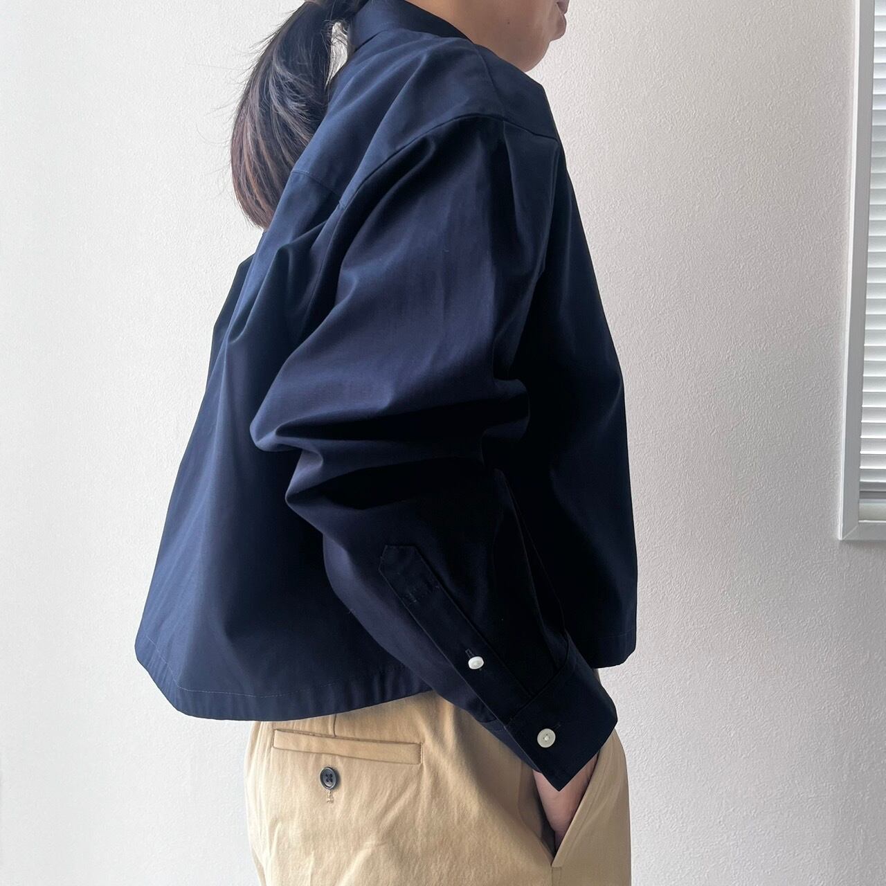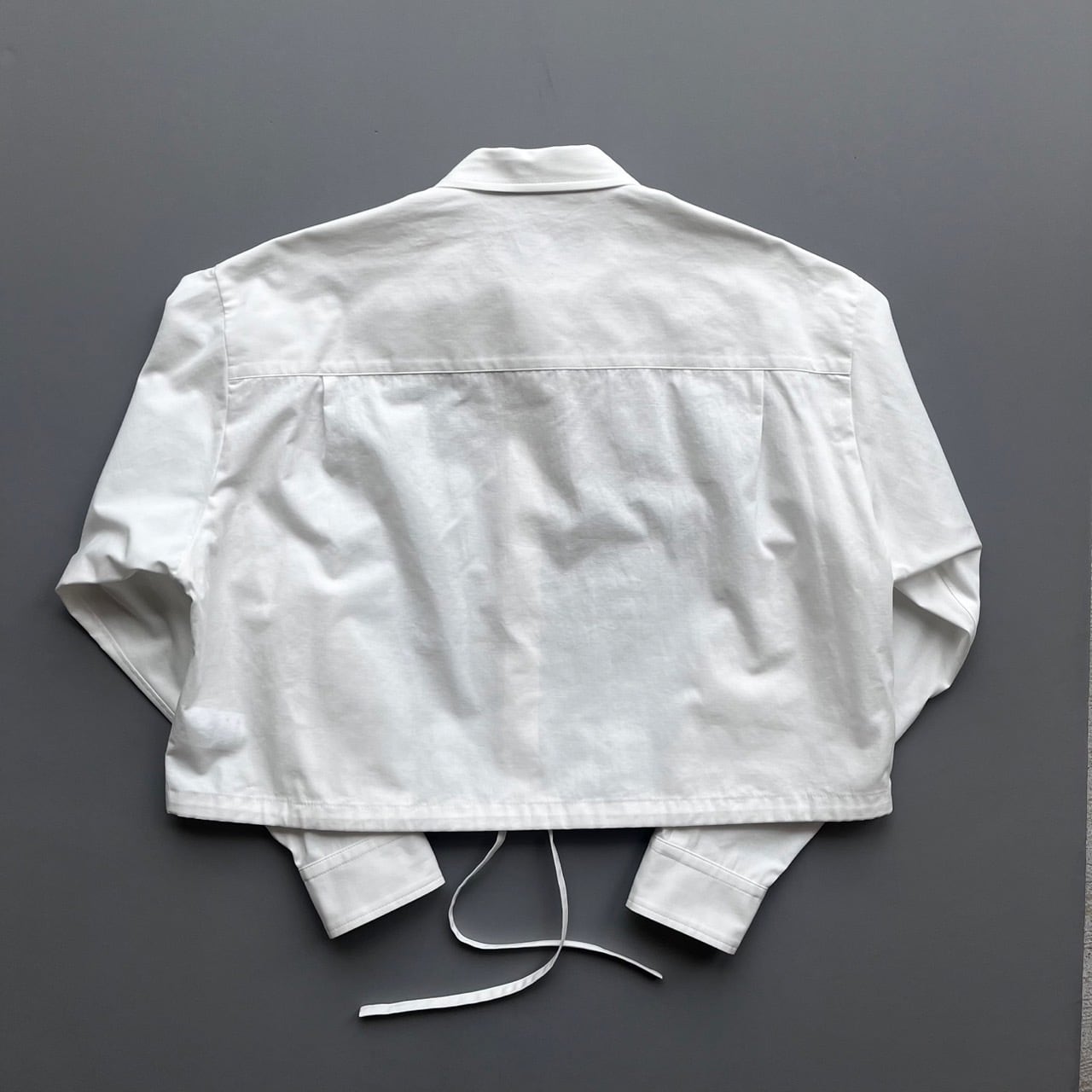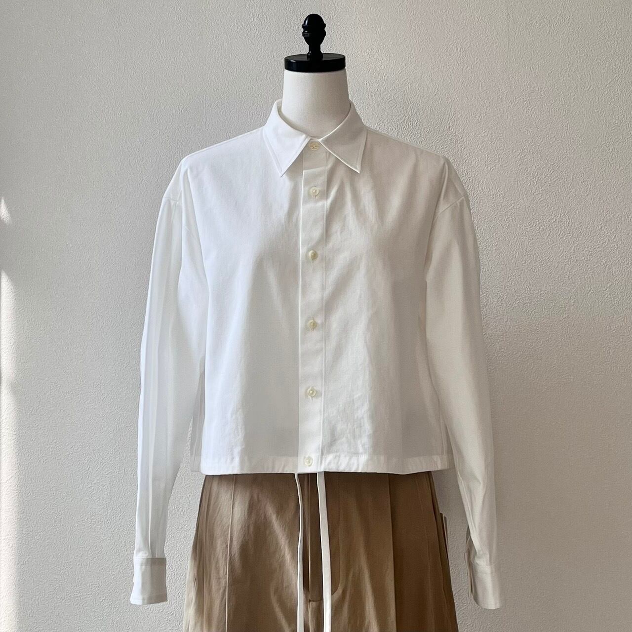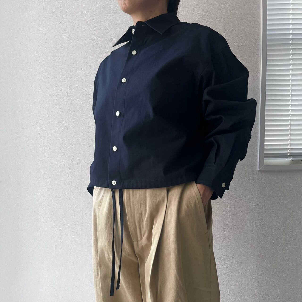 ショートレングスのゆとりあるフィット感を裾部分のドローストリングを絞ったり、伸ばしたりして着回しを楽しめるブラウス。ワイドなボトムと合わせて、シャツとして、また羽織としてのスタイリングをお楽しみ下さい。