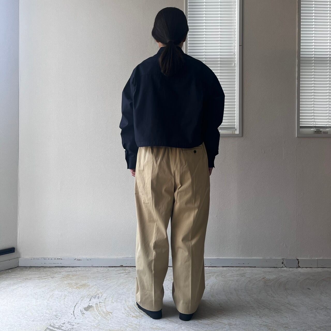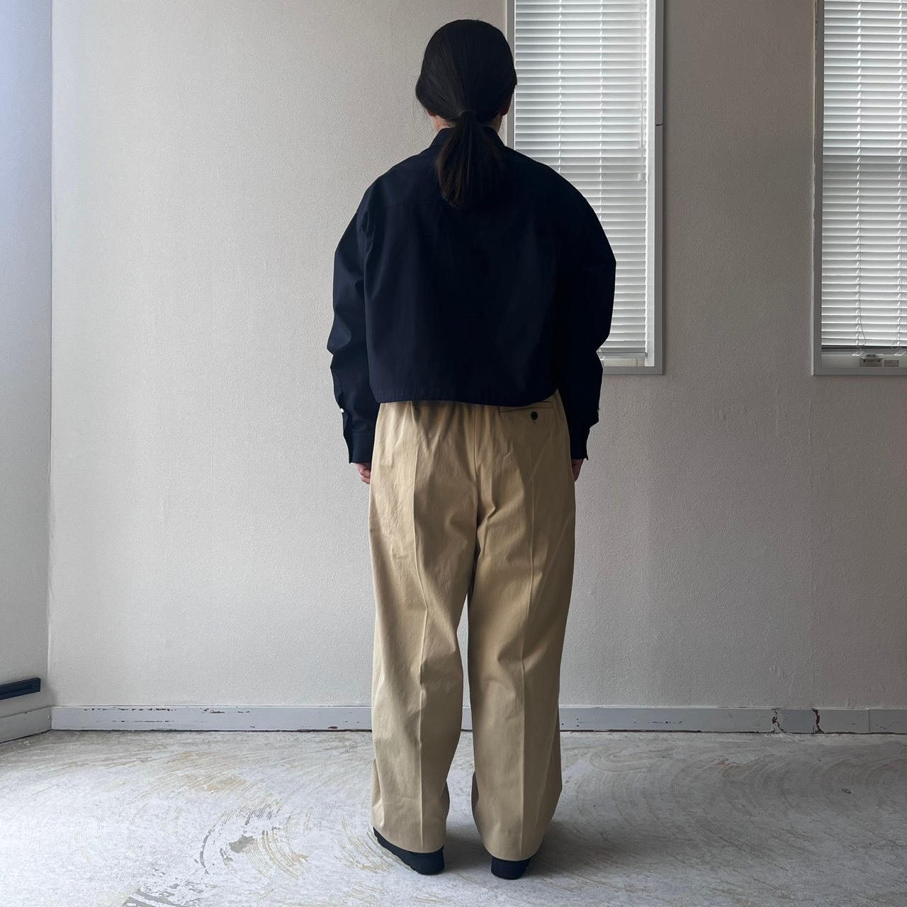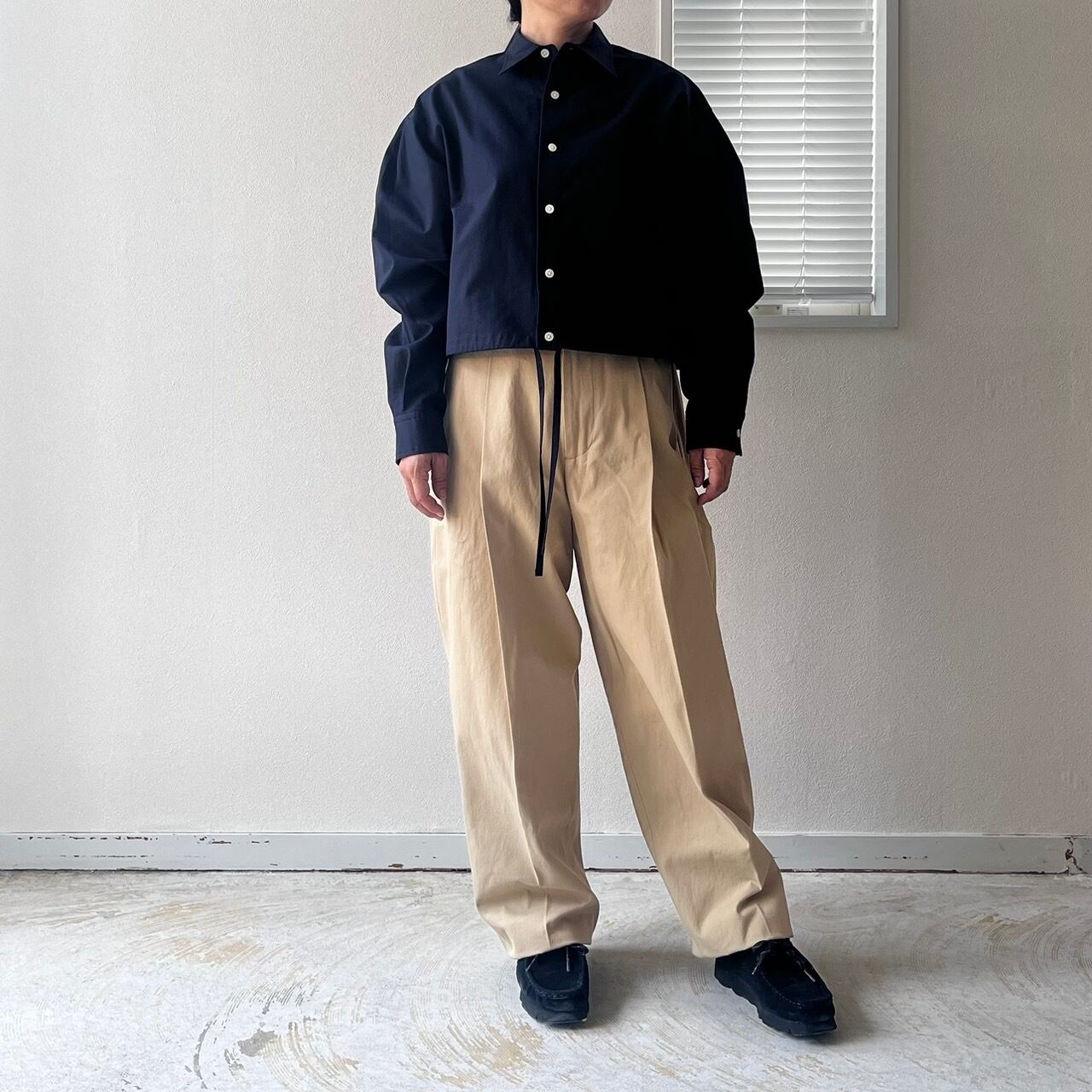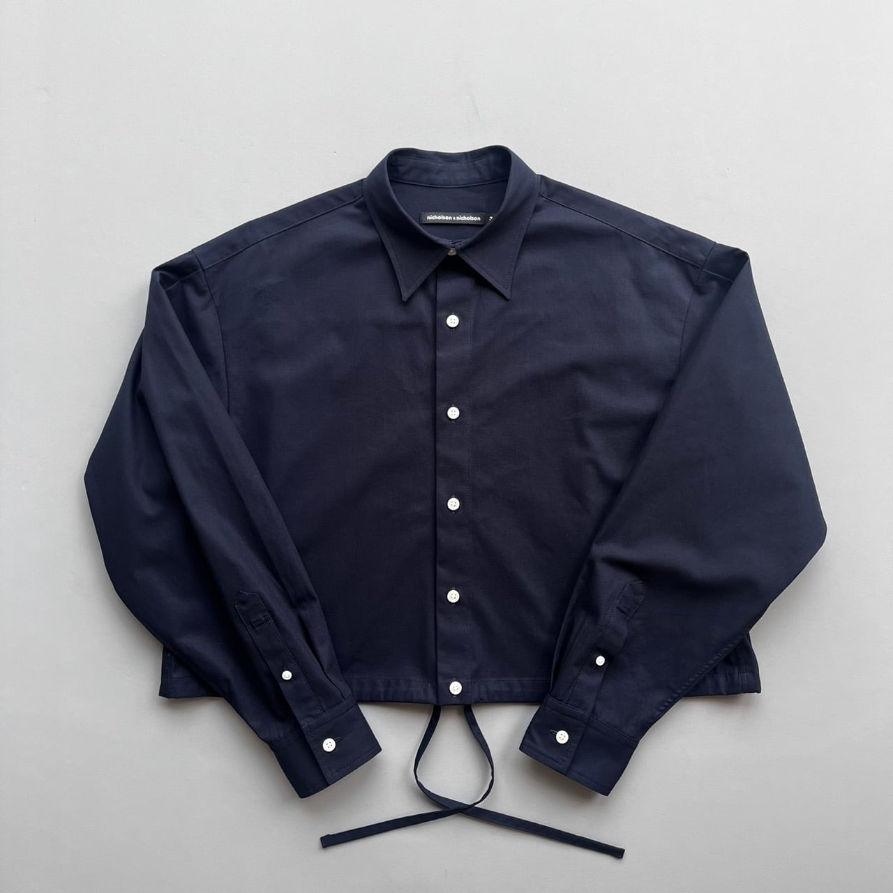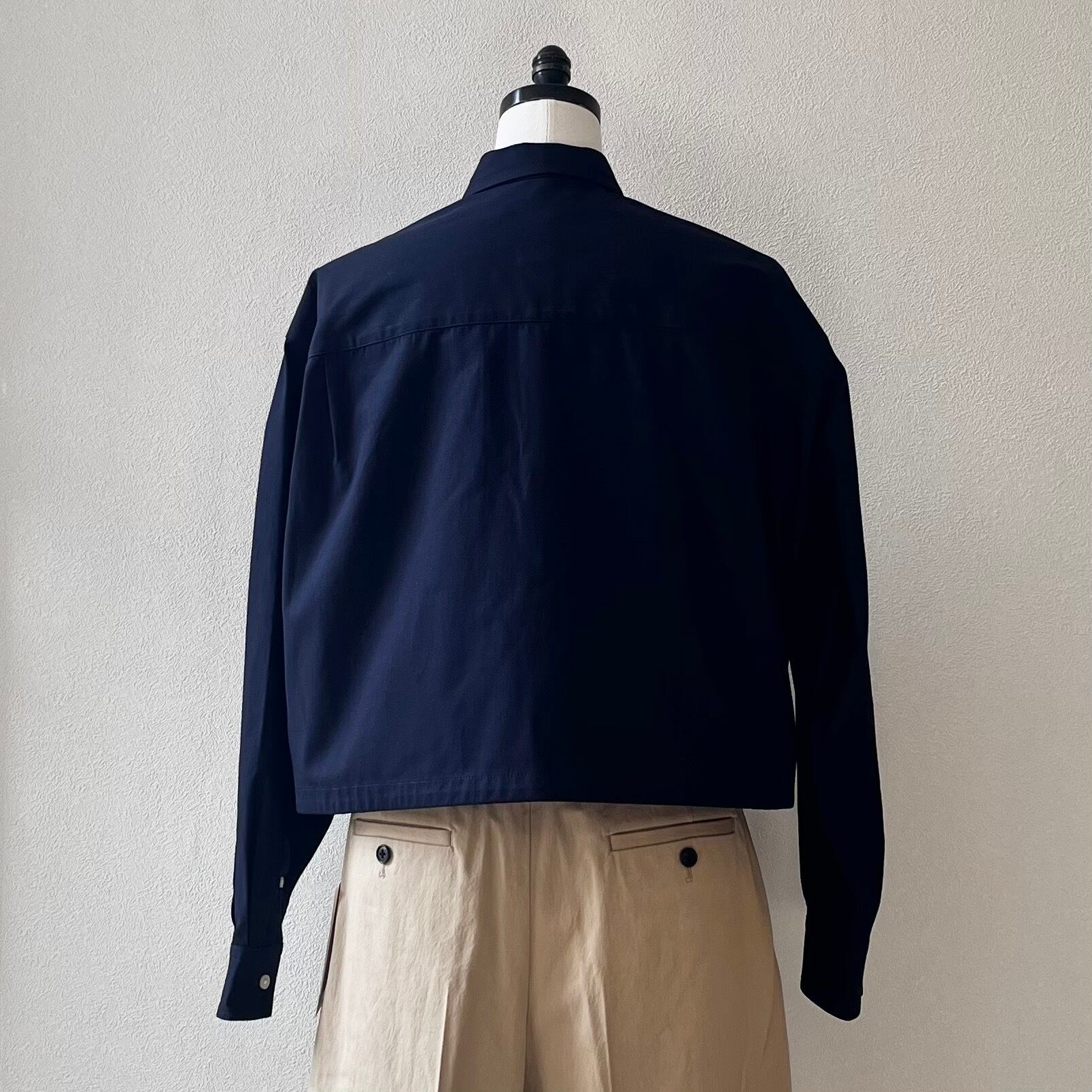 ショートレングスのゆとりあるフィット感を裾部分のドローストリングを絞ったり、伸ばしたりして着回しを楽しめるブラウス。ワイドなボトムと合わせて、シャツとして、また羽織としてのスタイリングをお楽しみ下さい。