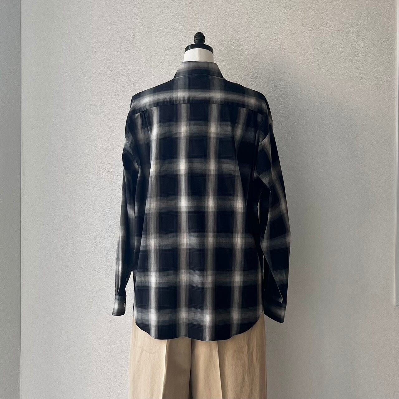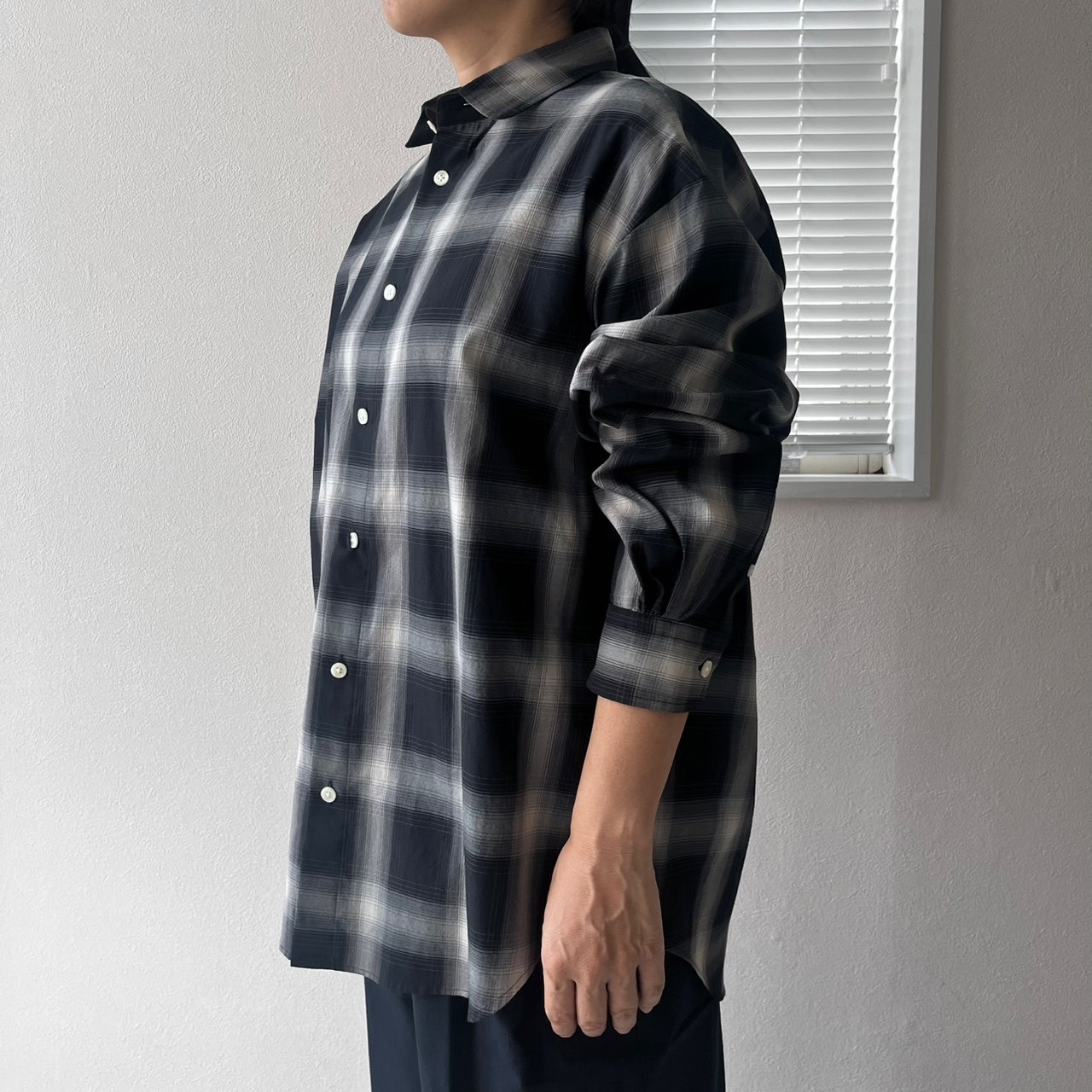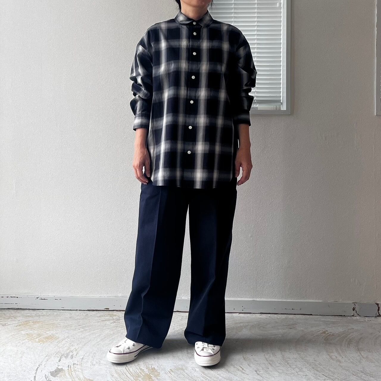 ユニセックスとして作ったビッグシルエットと、すっきりと沿うように設定した首回りのバランスとラウンドカラーがポイントです。ゆとりある着心地がレイヤードにも最適。裾のサイドに付いた釦でカシュクールとしても着こなせる2WAY仕様です。