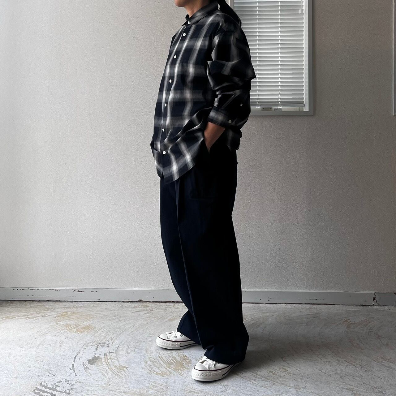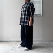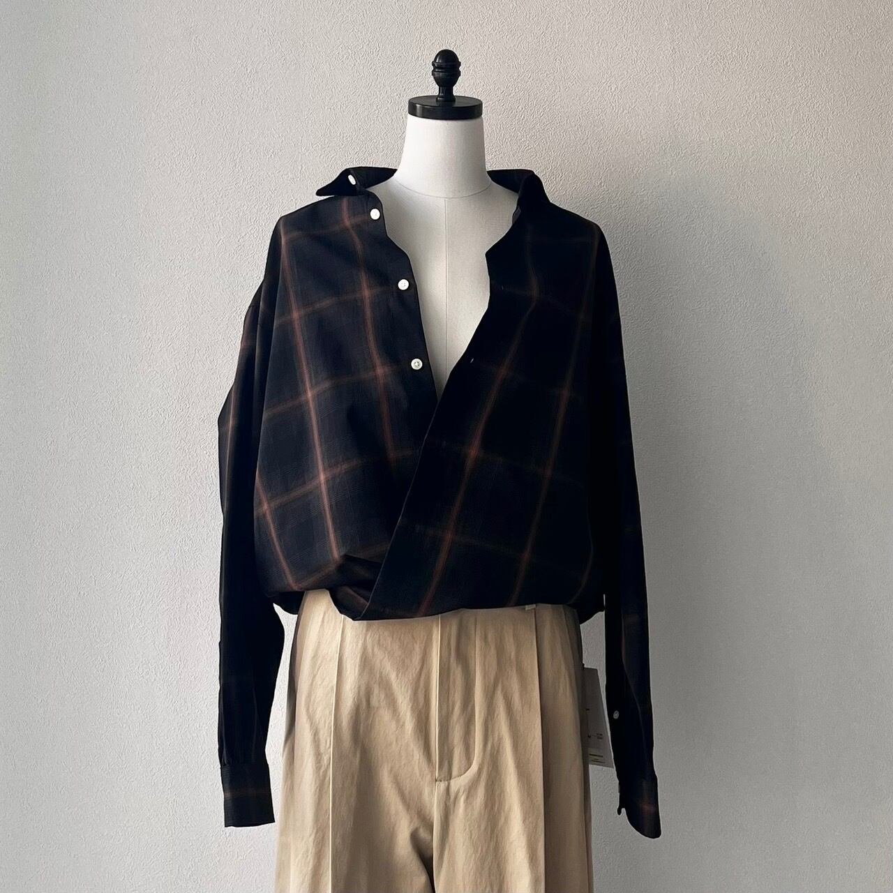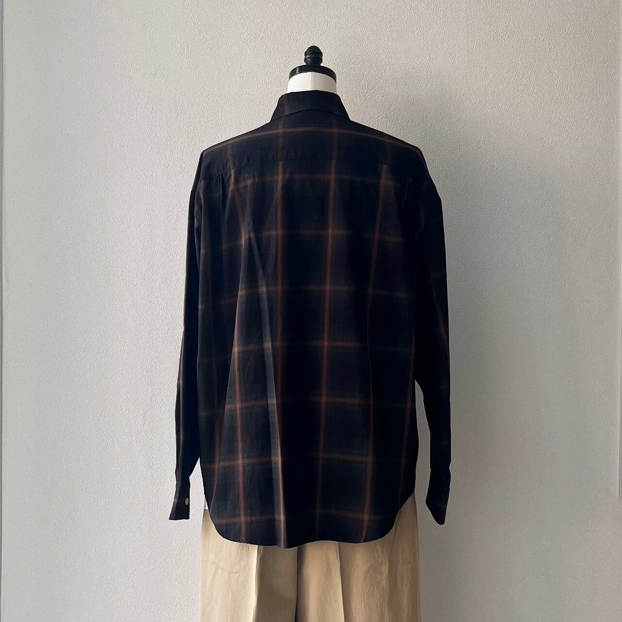 ユニセックスとして作ったビッグシルエットと、すっきりと沿うように設定した首回りのバランスとラウンドカラーがポイントです。ゆとりある着心地がレイヤードにも最適。裾のサイドに付いた釦でカシュクールとしても着こなせる2WAY仕様です。
