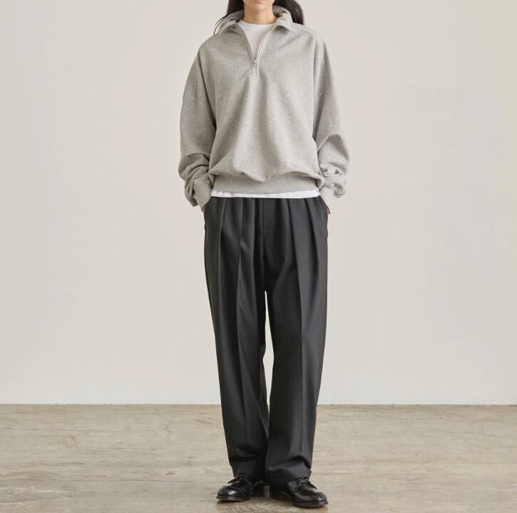 ユニセックスで作ったビッグシルエットと、デザインシームがポイントのハイネックロングスリーブスエットシャツ。ハーフジップファスナーをあしらいハイネックで着ても、ファスナーを下げて衿のように見せて着てもこの一枚で新しさを演出出来ます。ワンマイルウエアからタウンユースまで幅広いスタイルをお楽しみいただけます。