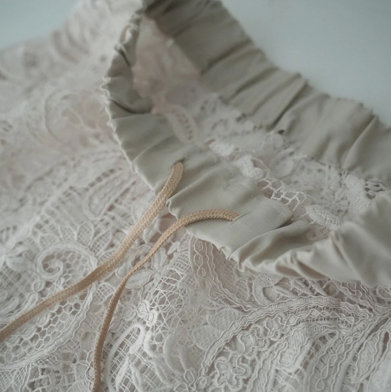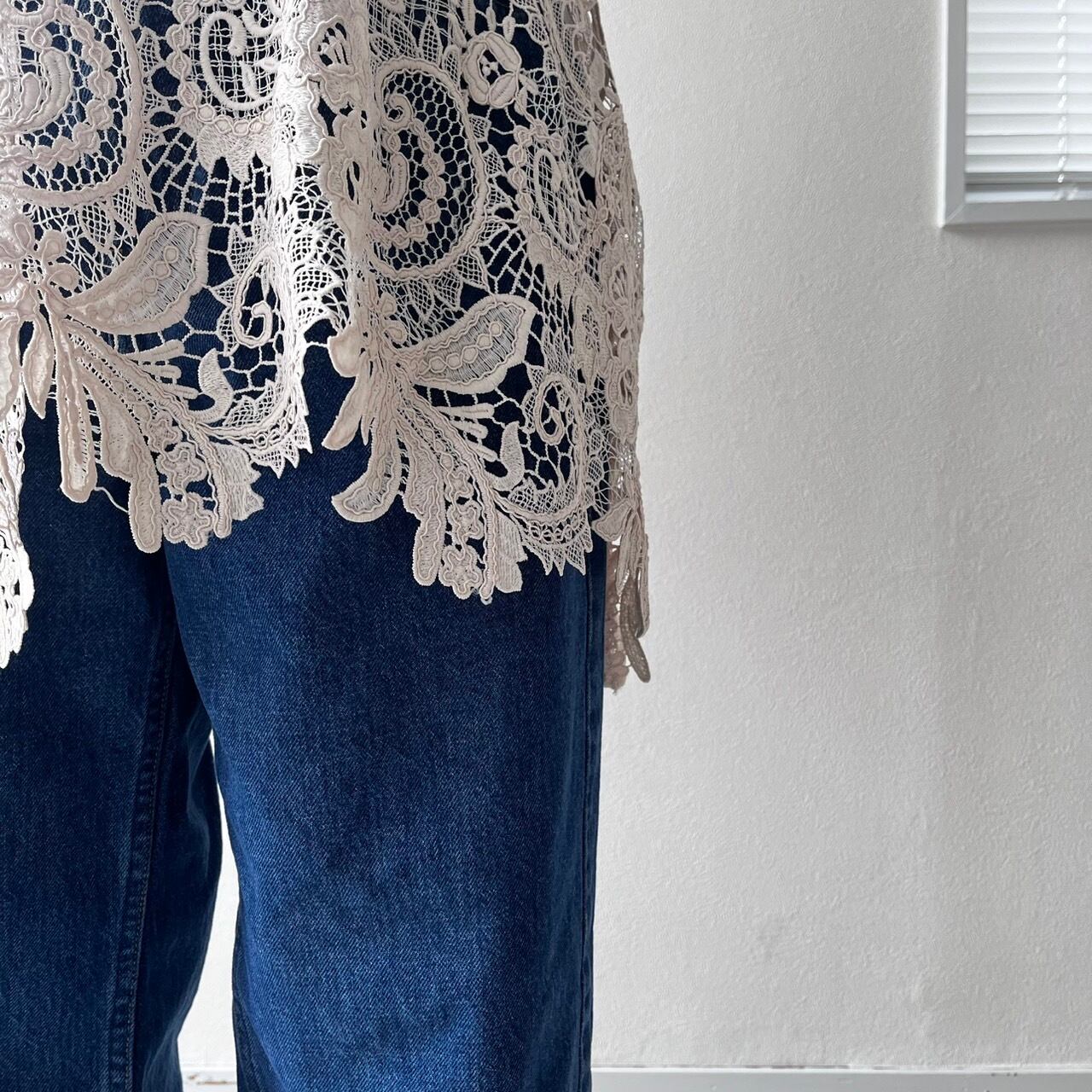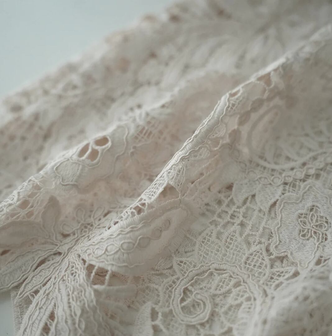 素材は刺繍レースにコードを絡ませることで立体的な表現と繊細さも感じさせるケミカルレースです。