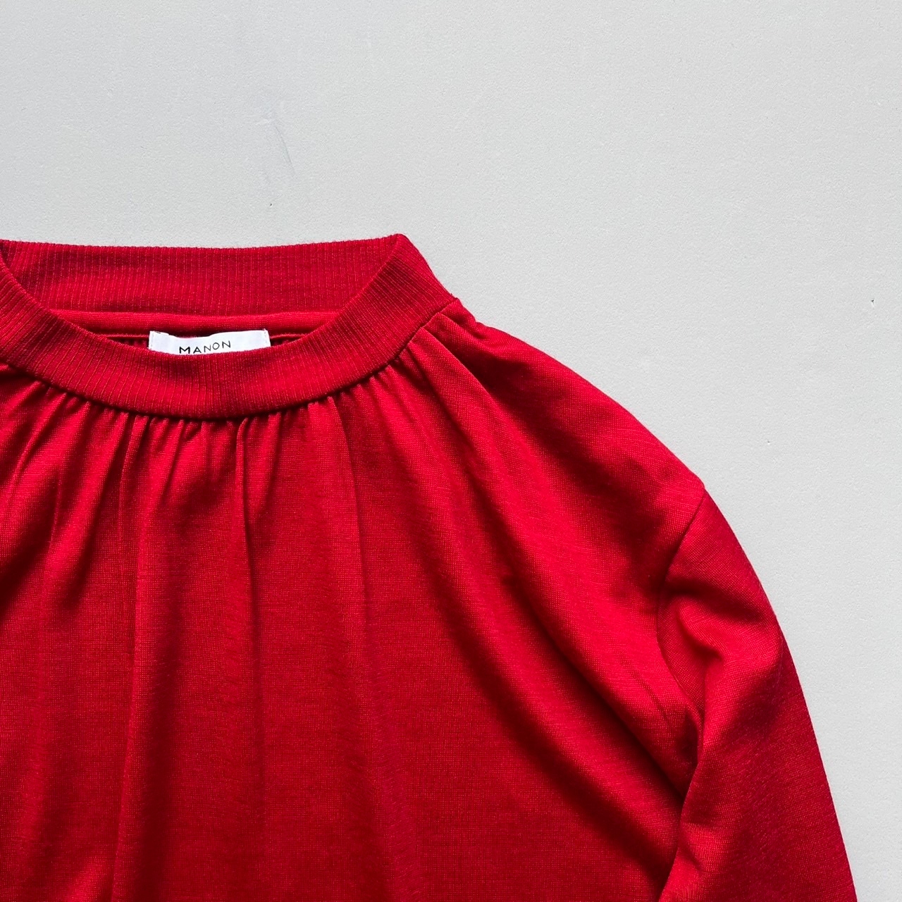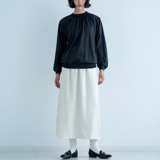 衿ぐりにギャザーを入れ柔らかくふんわりとしたシルエットに仕上げました。