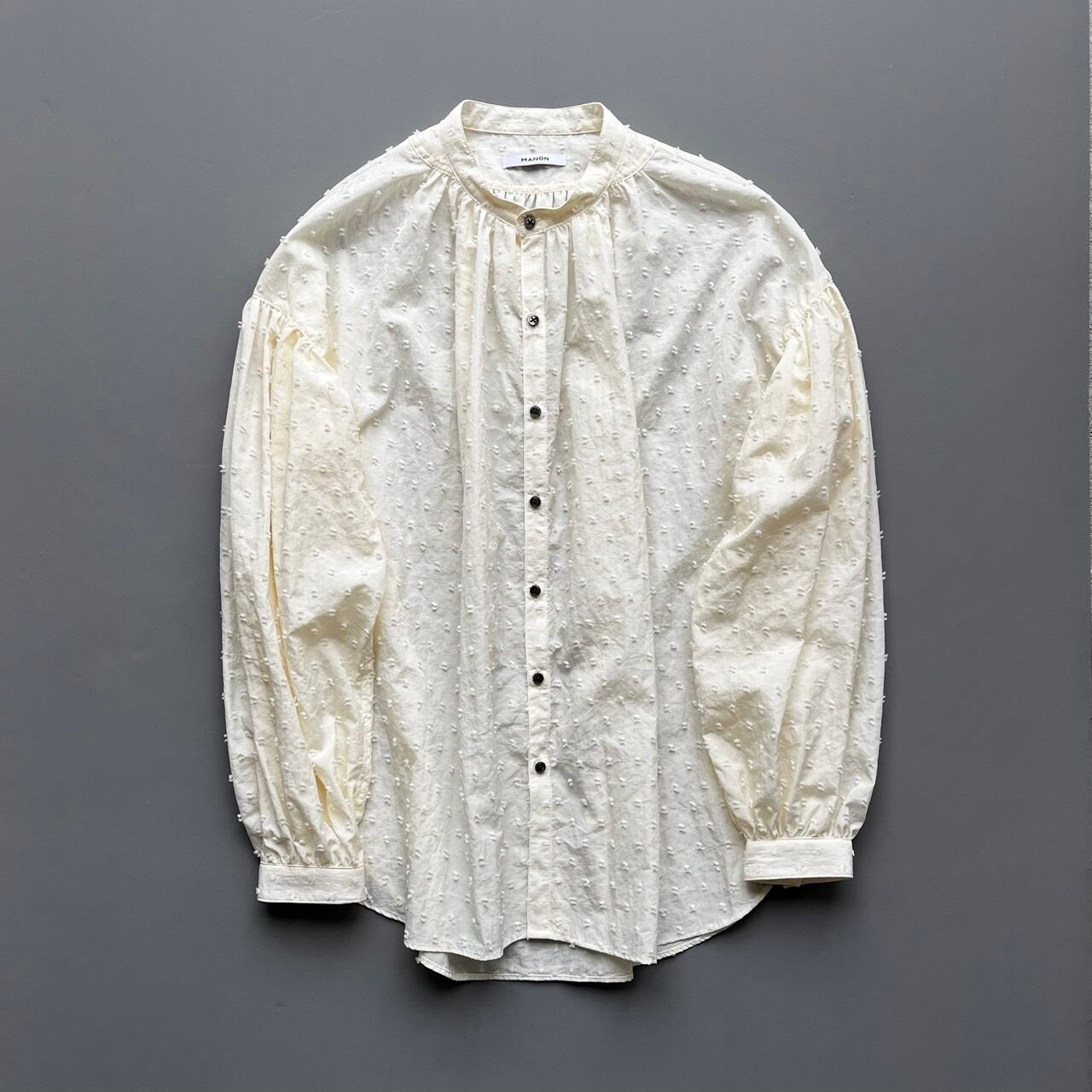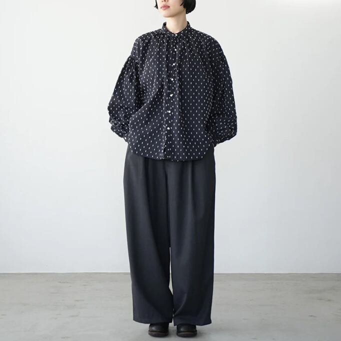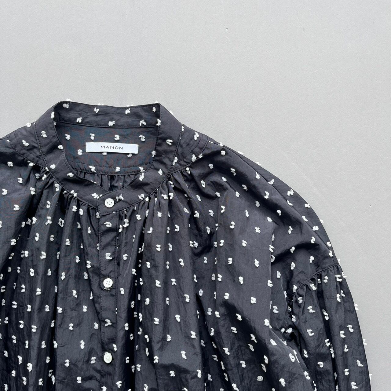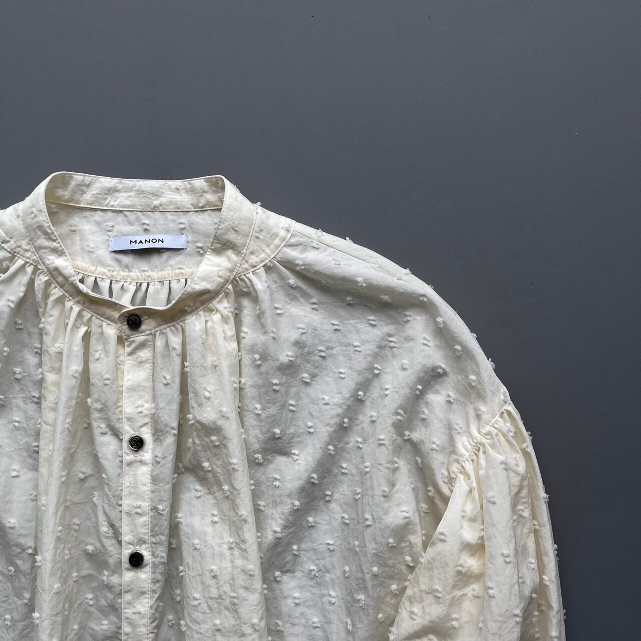 衿はバンドカラーで肩を落とし、衿周りから後ヨーク、袖口にたっぷりとギャザーを入れた柔らかな膨らみのあるMANON定番のアミカルシャツです。