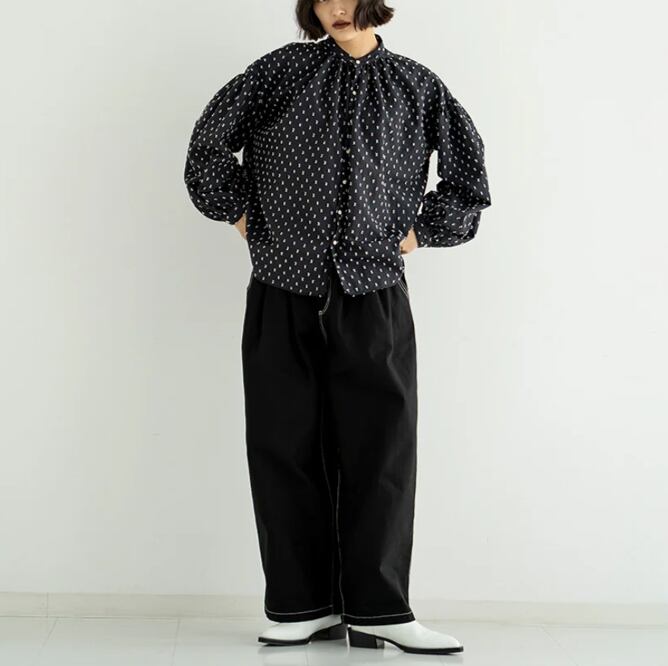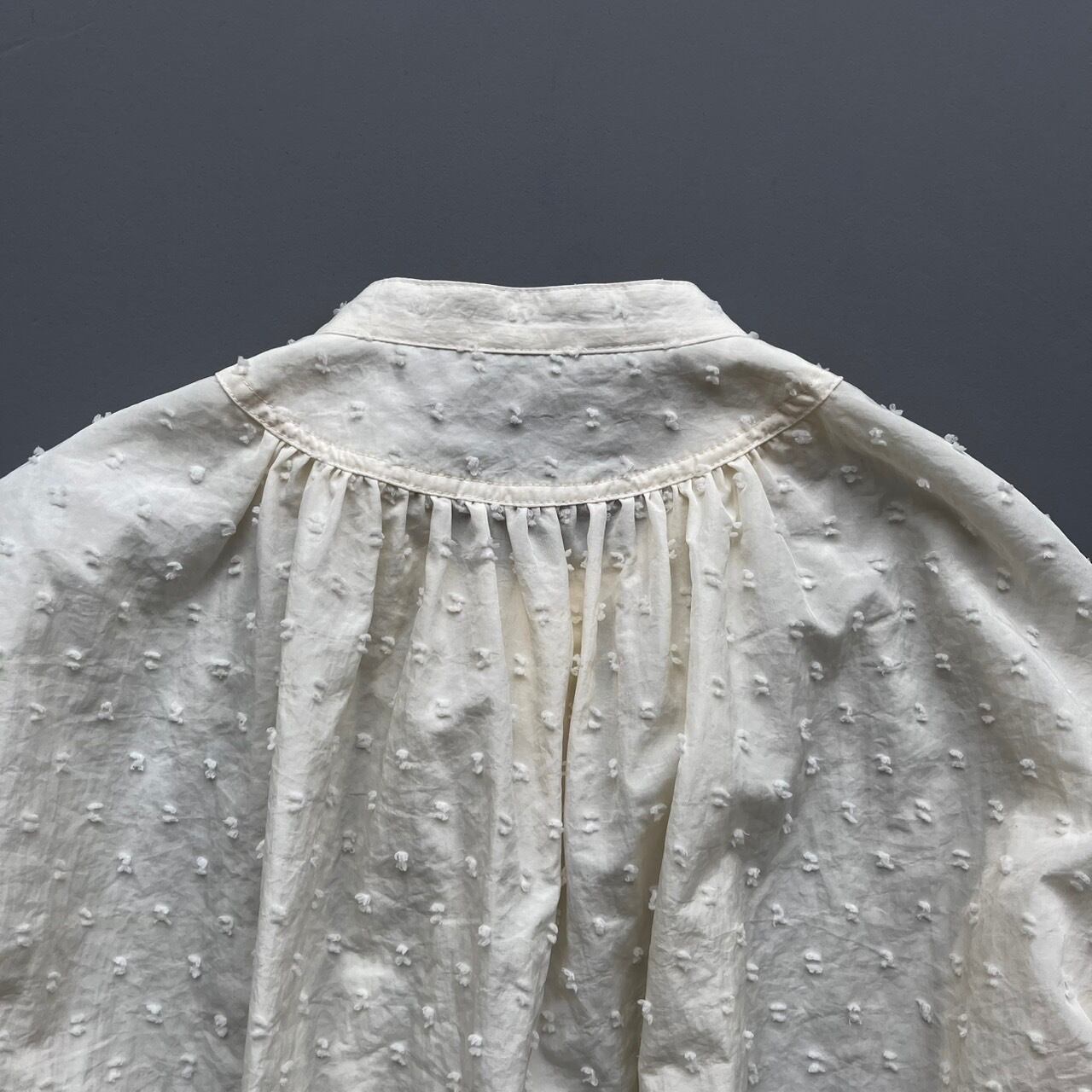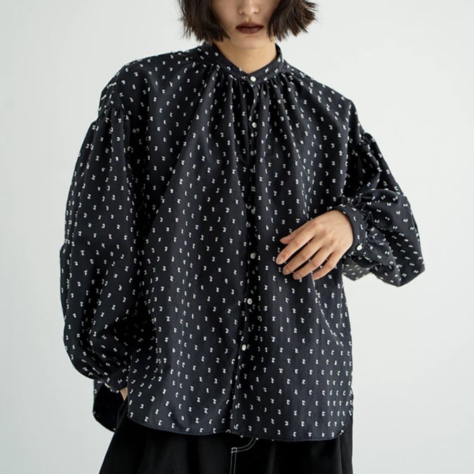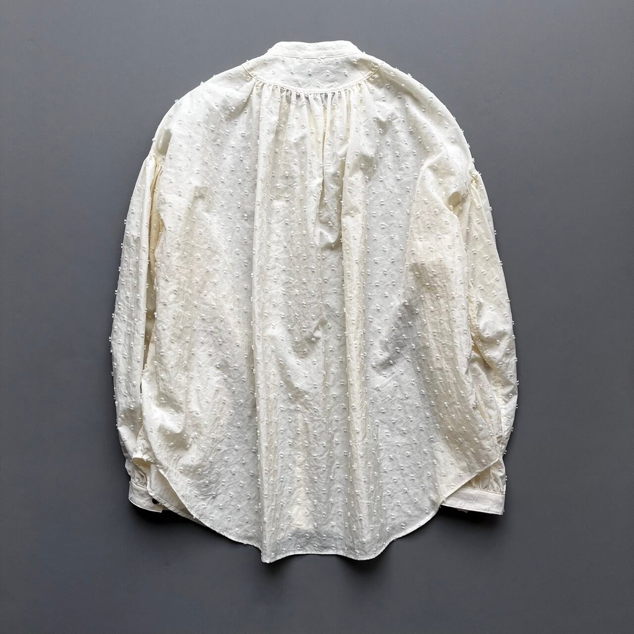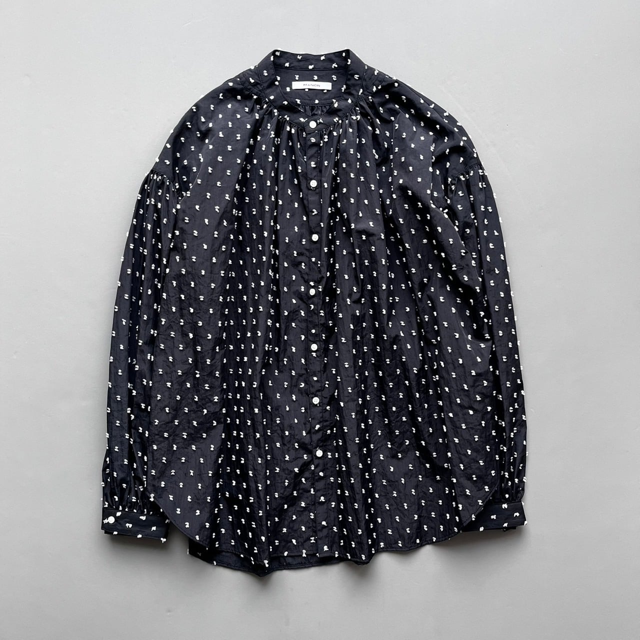 衿はバンドカラーで肩を落とし、衿周りから後ヨーク、袖口にたっぷりとギャザーを入れた柔らかな膨らみのあるMANON定番のアミカルシャツです。