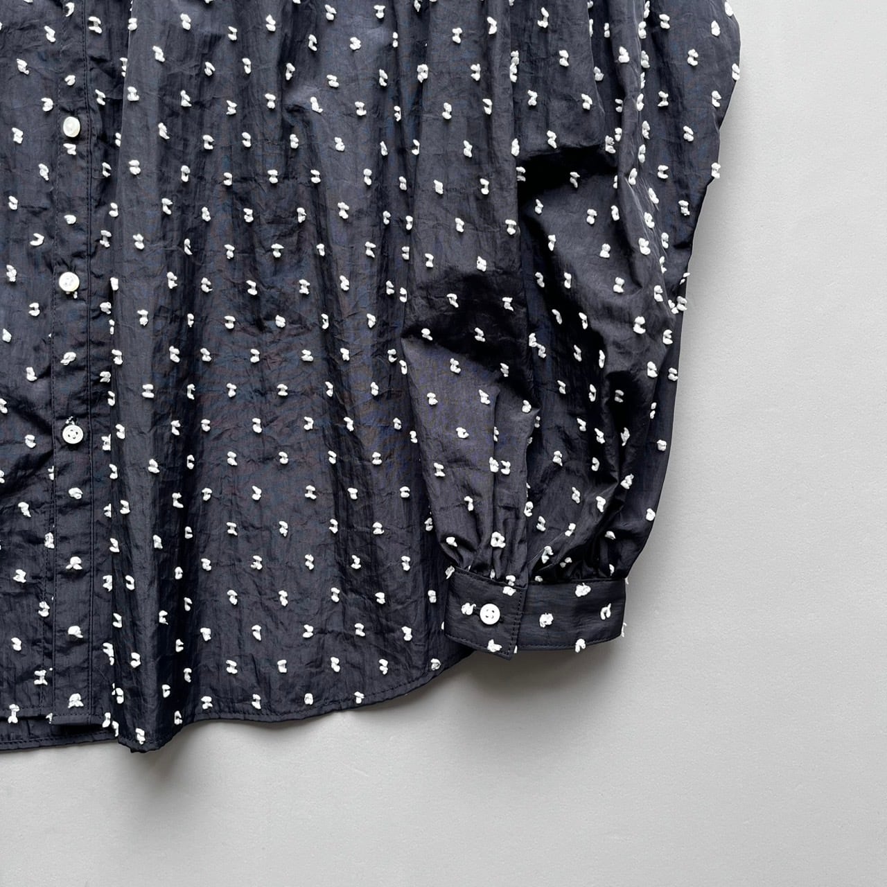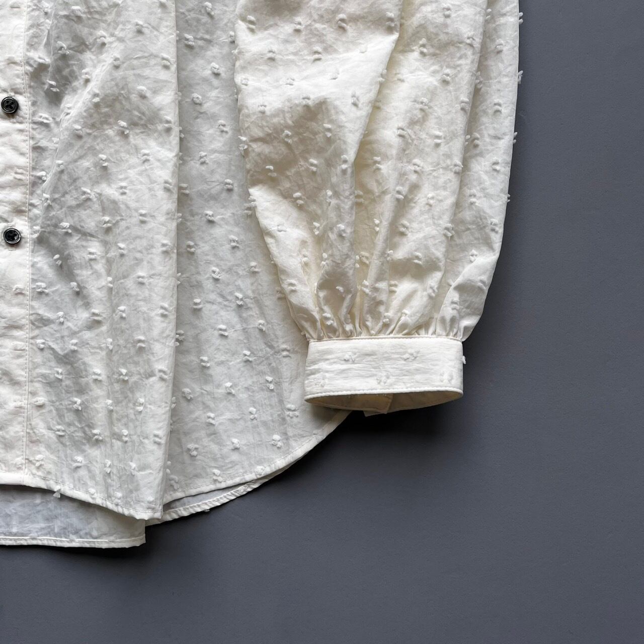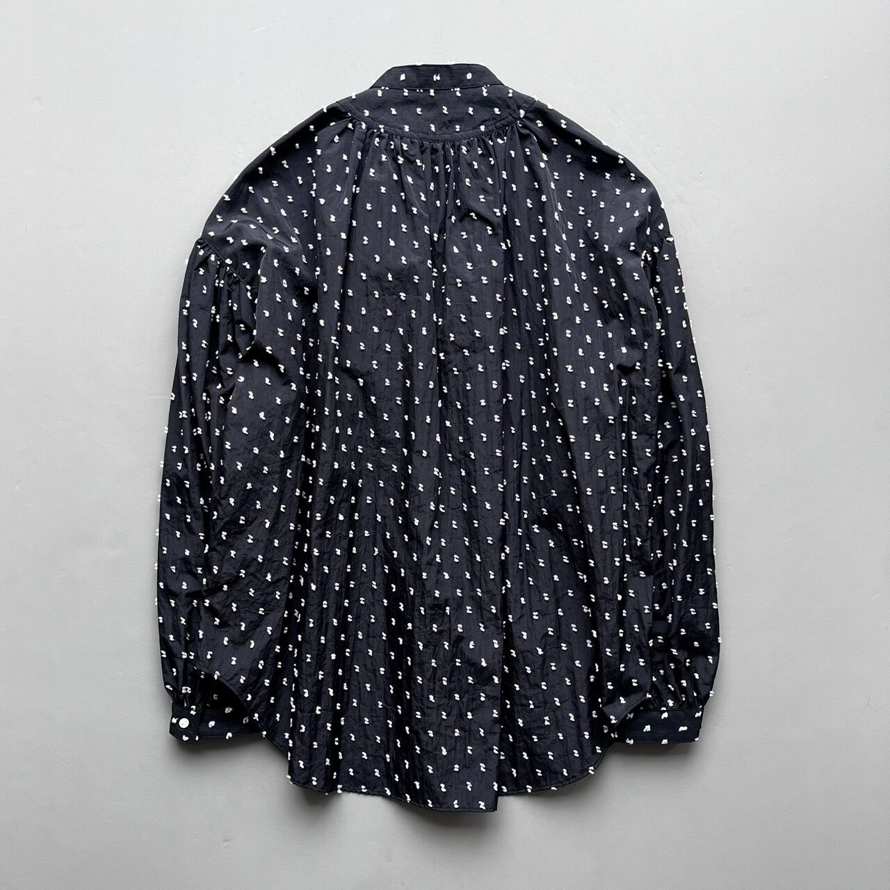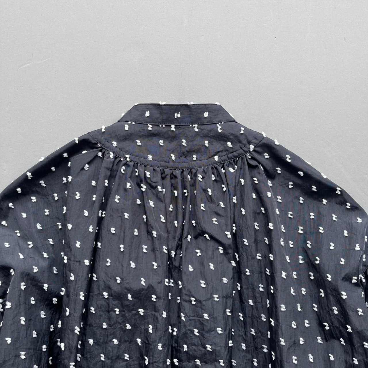 衿はバンドカラーで肩を落とし、衿周りから後ヨーク、袖口にたっぷりとギャザーを入れた柔らかな膨らみのあるMANON定番のアミカルシャツです。