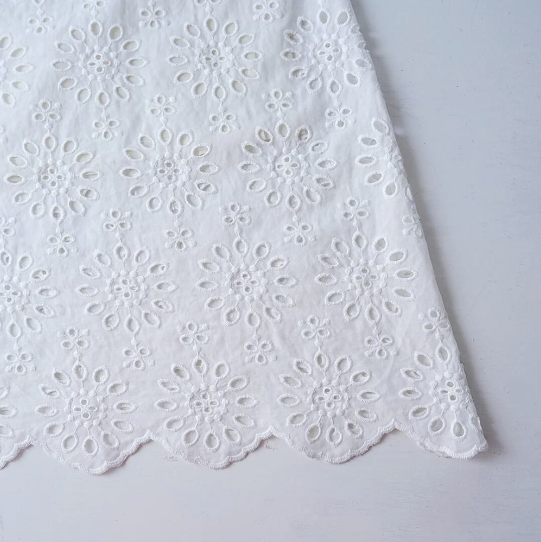 綿60/1のベース生地に綿のボーラー刺繍を施した大胆なカットのスカラップ花柄刺繍です。
