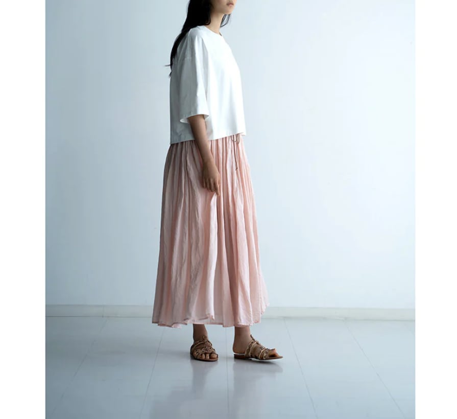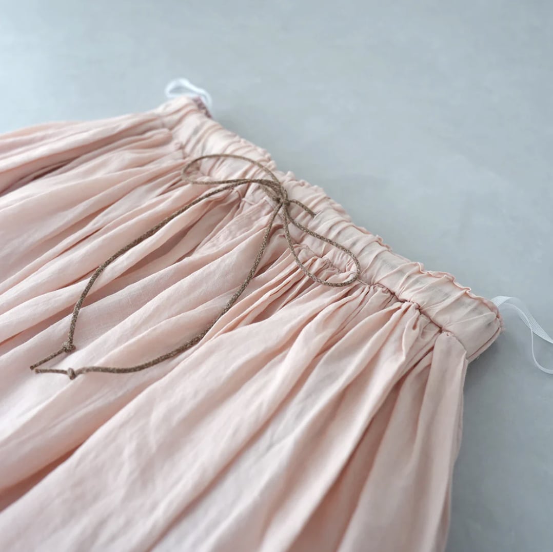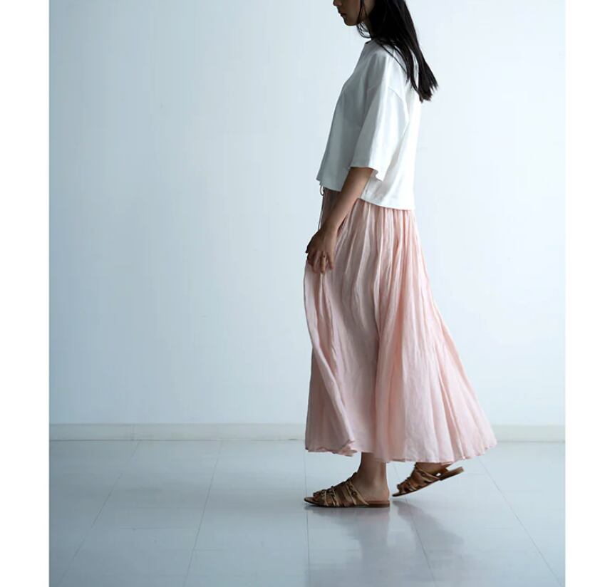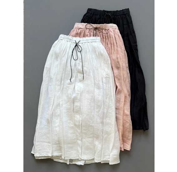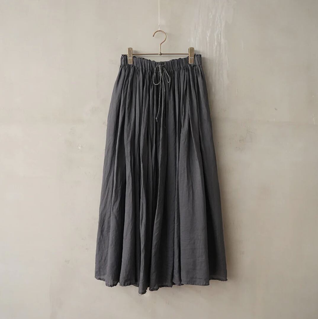 160番手の極細ラAAミーを使用し、繊細さと光沢に加え適度なハリ感と高級感のある素材です。オーバーダイ(製品染め)で独特な色味や風合いを楽しめるMANONオリジナルカラーを出しています。ウエストはゴム+スピンドル仕様で脇はシームポケット付きです。生地をたっぷりと使用し裾にかけてふわっとしたボリューム感を楽しみながらも広がり過ぎないシルエットで、ラミーの心地良さをお楽しみできます。秋冬もレギンスやタイツと組み合わせてワードローブのアイテムとして重宝していただけます。※ペチコートが付属しています。