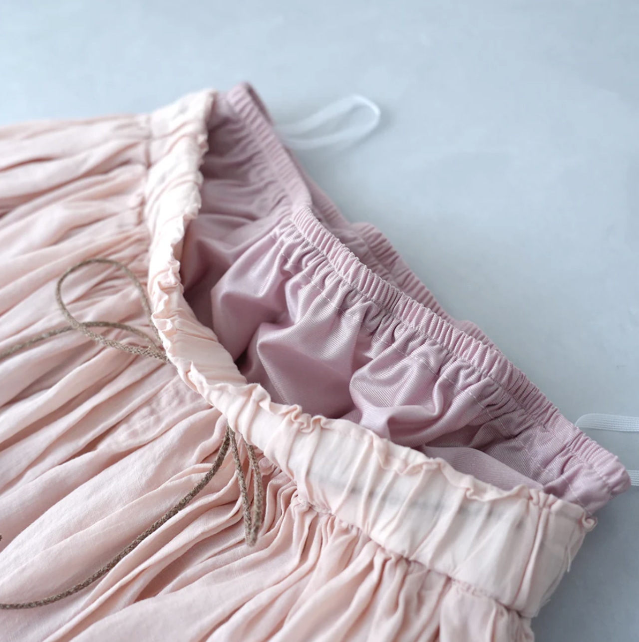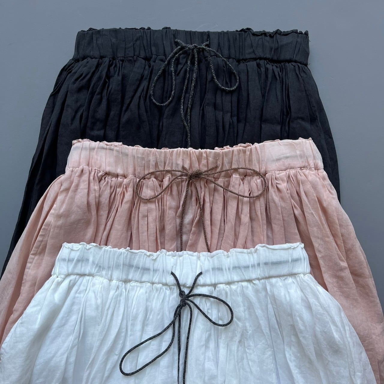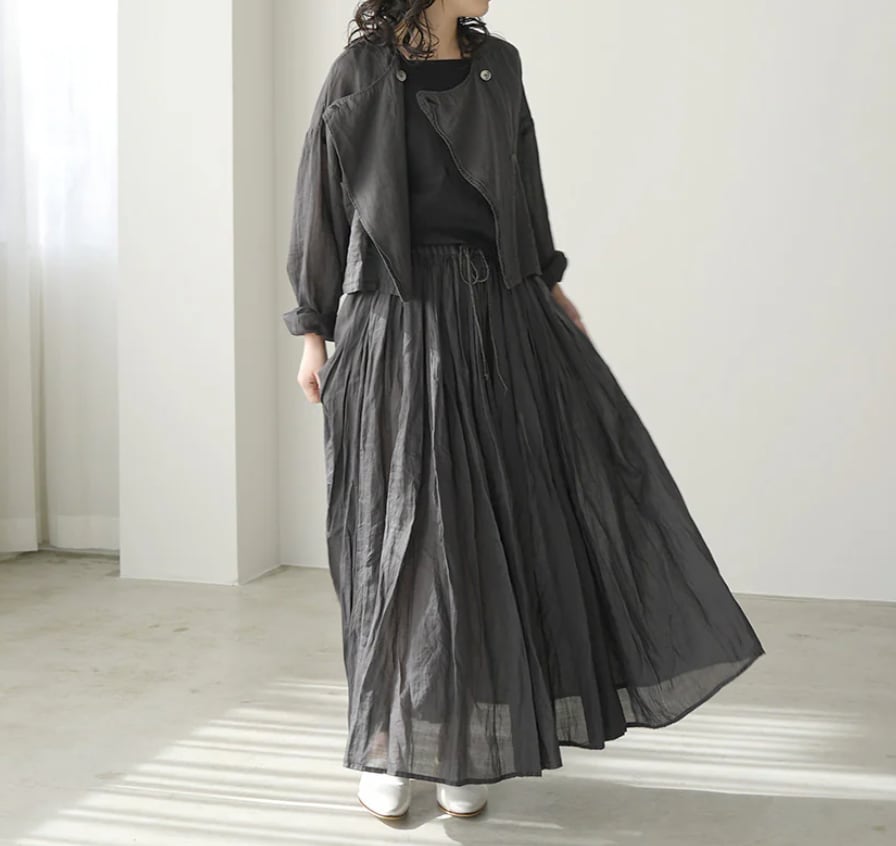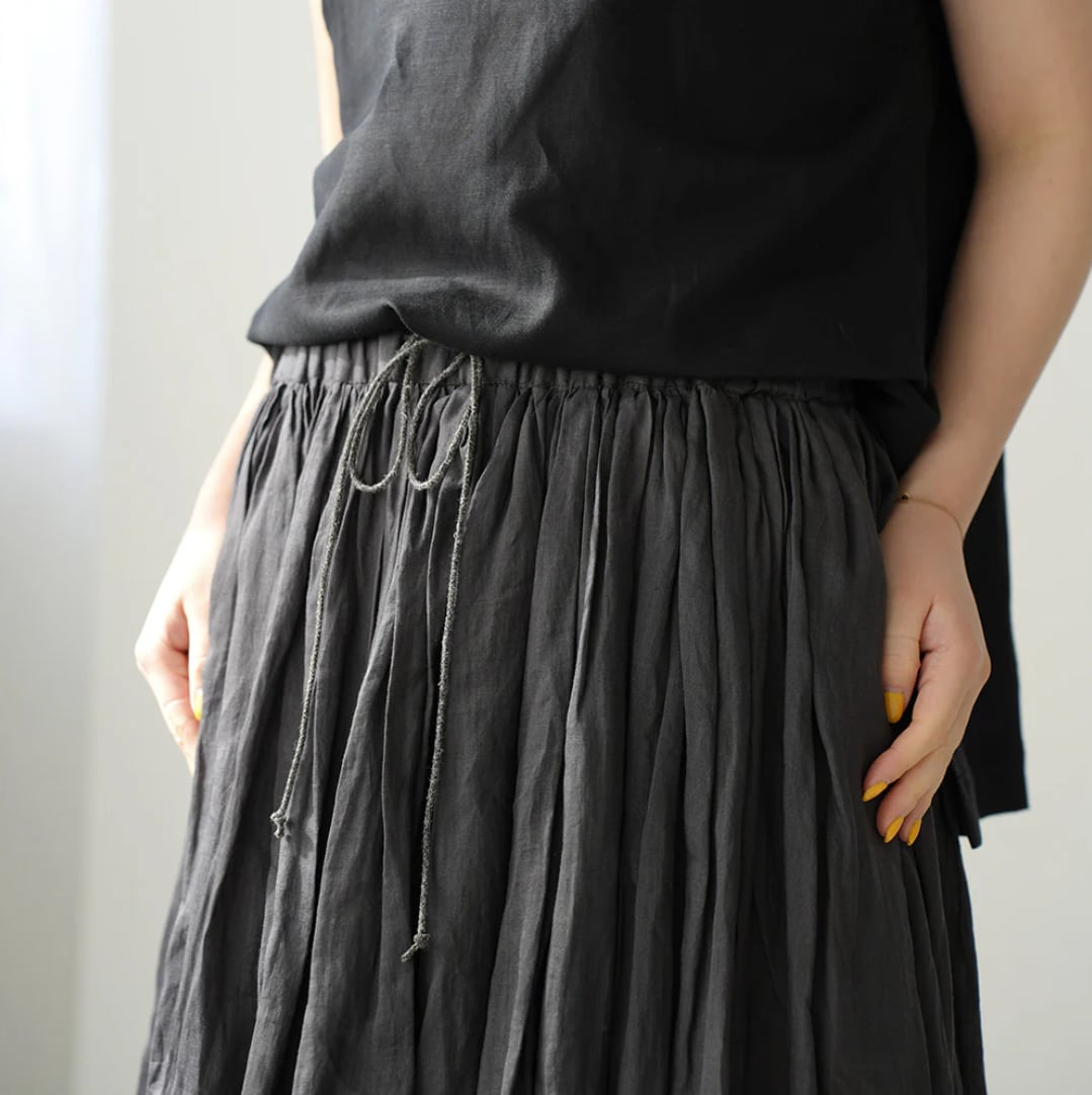 160番手の極細ラAAミーを使用し、繊細さと光沢に加え適度なハリ感と高級感のある素材です。オーバーダイ(製品染め)で独特な色味や風合いを楽しめるMANONオリジナルカラーを出しています。ウエストはゴム+スピンドル仕様で脇はシームポケット付きです。生地をたっぷりと使用し裾にかけてふわっとしたボリューム感を楽しみながらも広がり過ぎないシルエットで、ラミーの心地良さをお楽しみできます。秋冬もレギンスやタイツと組み合わせてワードローブのアイテムとして重宝していただけます。※ペチコートが付属しています。