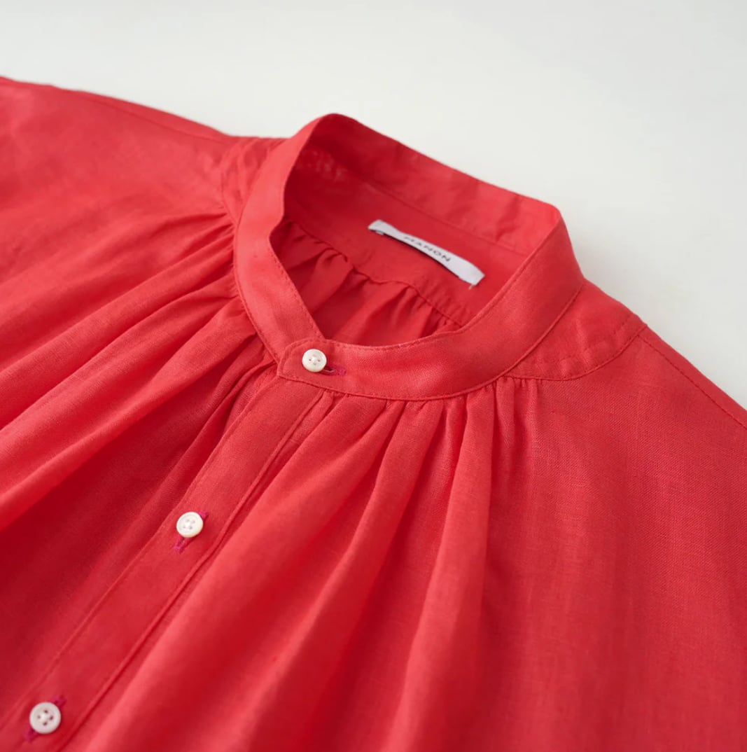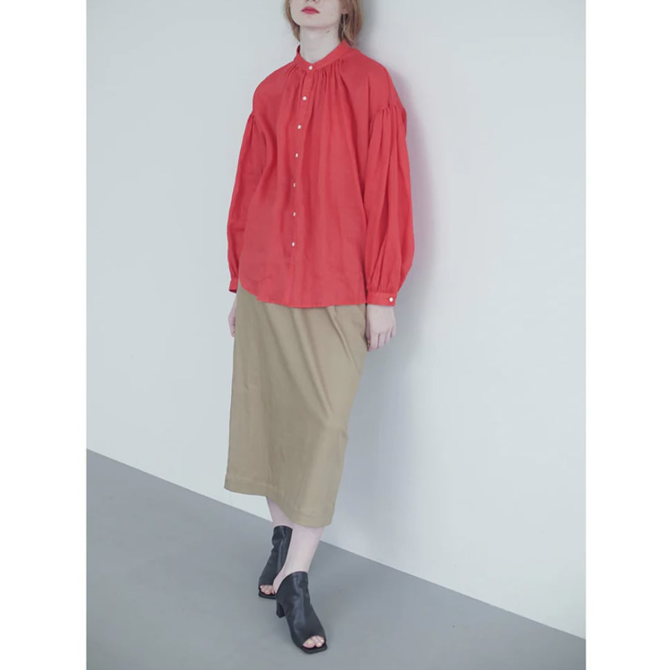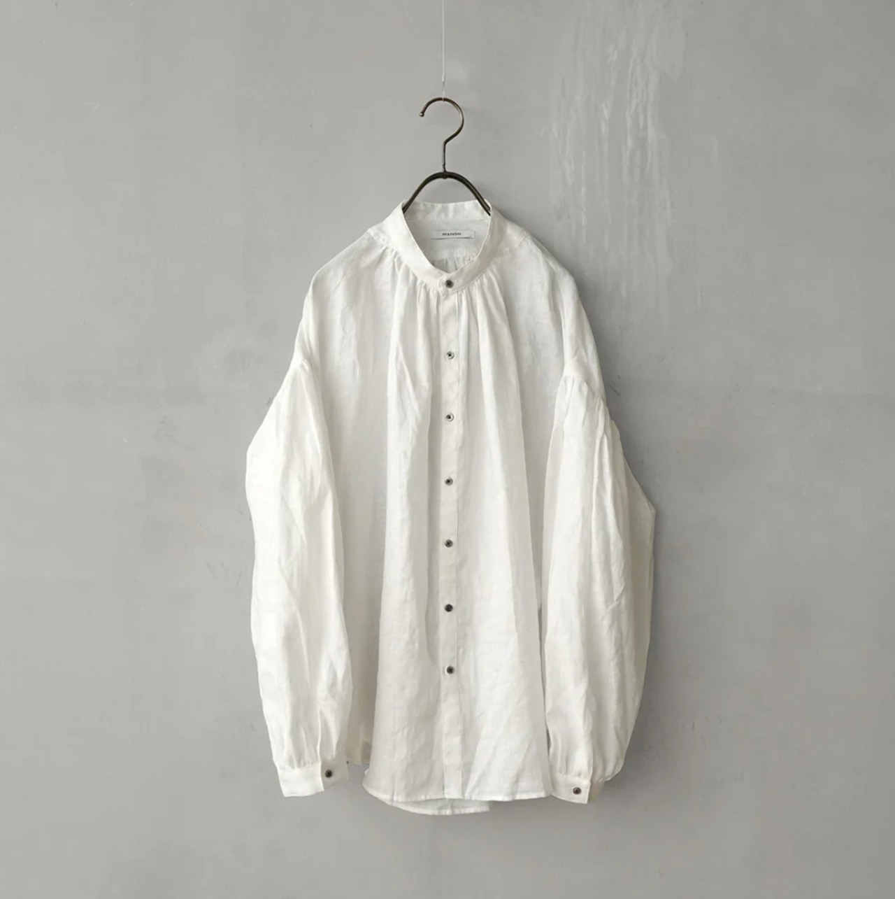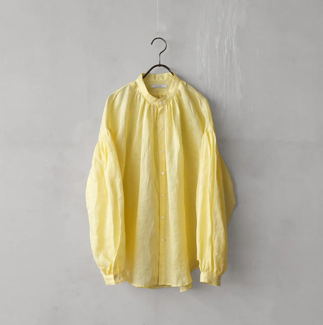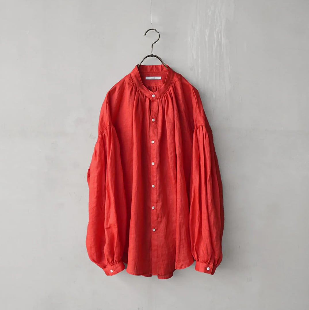 衿はバンドカラーで肩を落とし、衿周りから後ヨーク、袖口にたっぷりとギャザーを入れた柔らかな膨らみのあるMANON定番のアミカルシャツです。