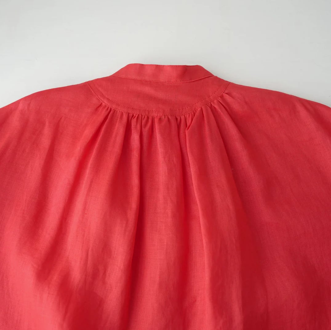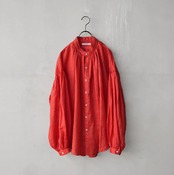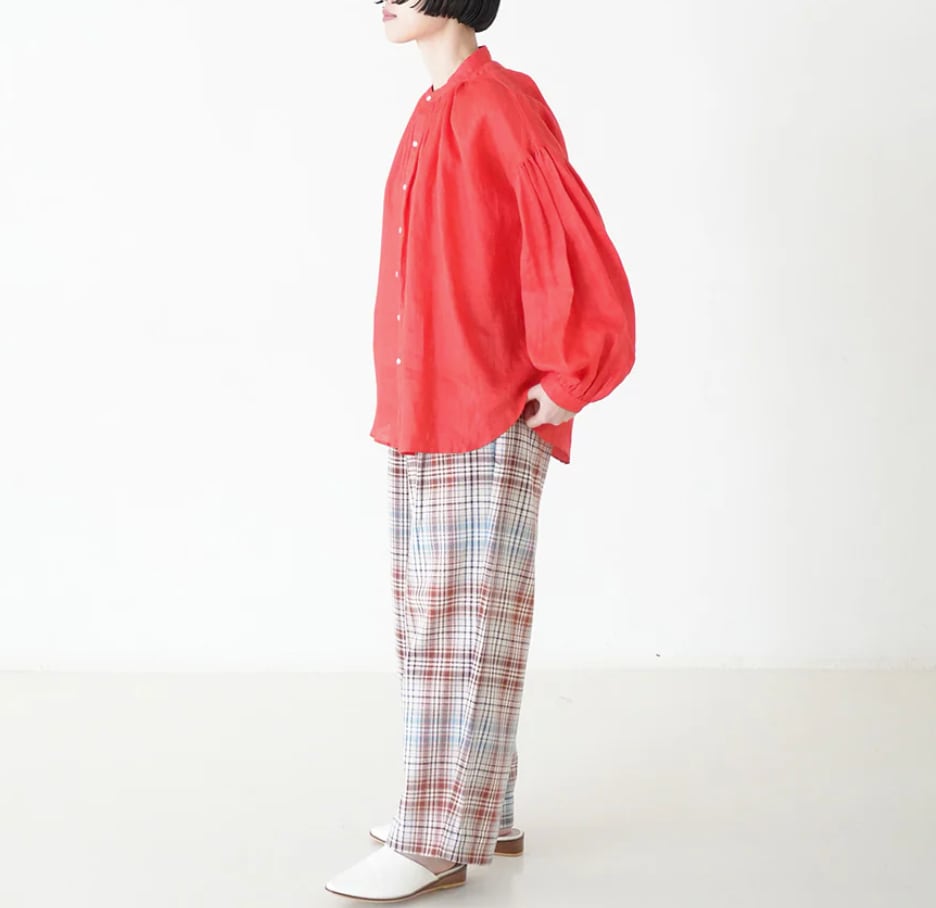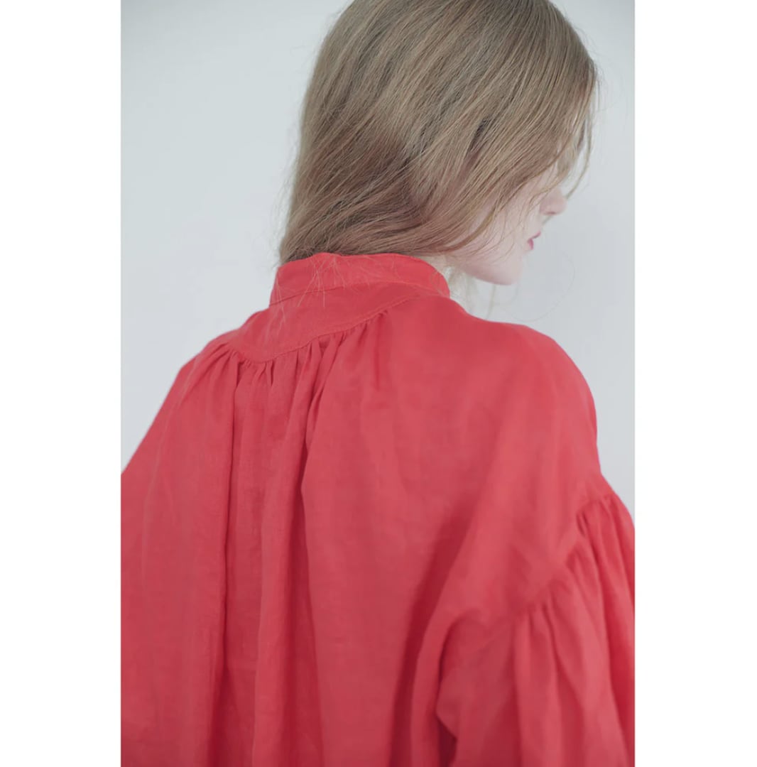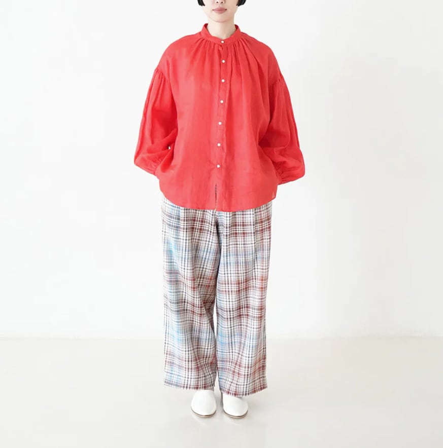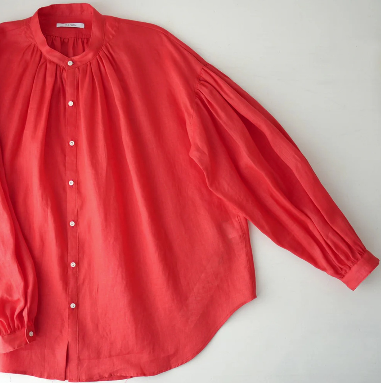 衿はバンドカラーで肩を落とし、衿周りから後ヨーク、袖口にたっぷりとギャザーを入れた柔らかな膨らみのあるMANON定番のアミカルシャツです。