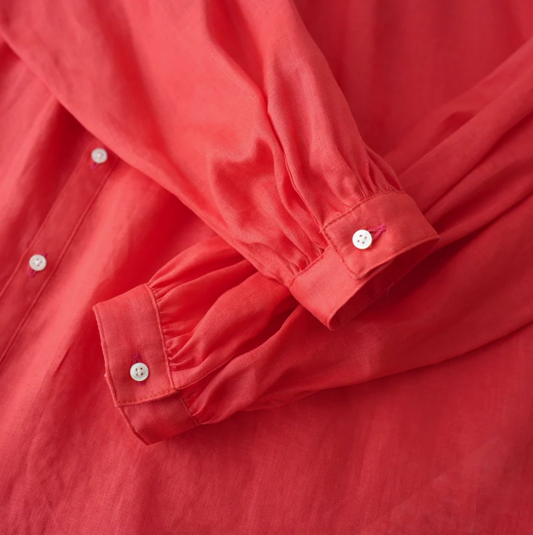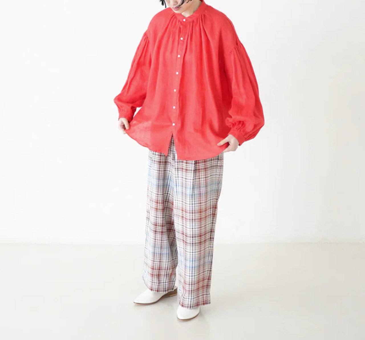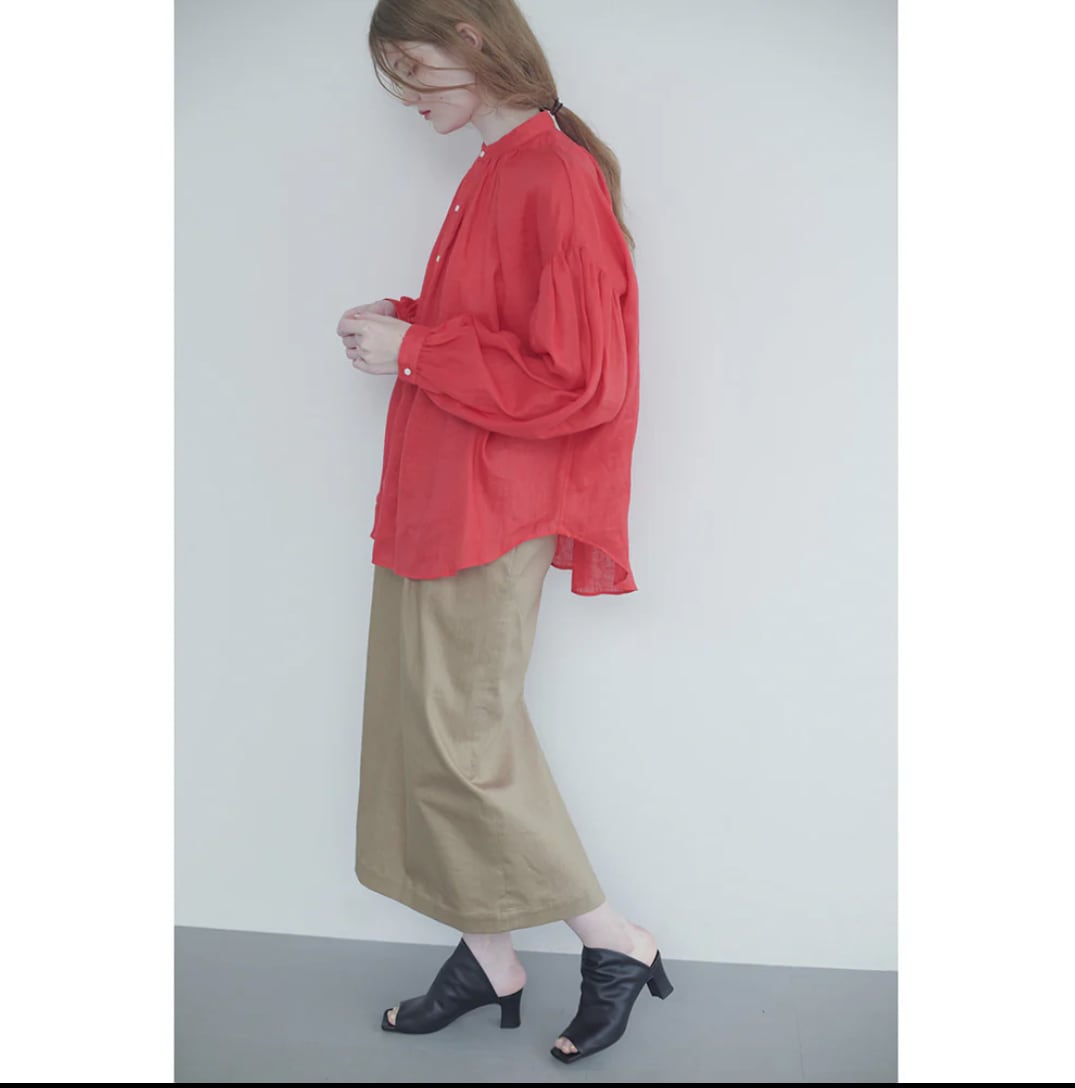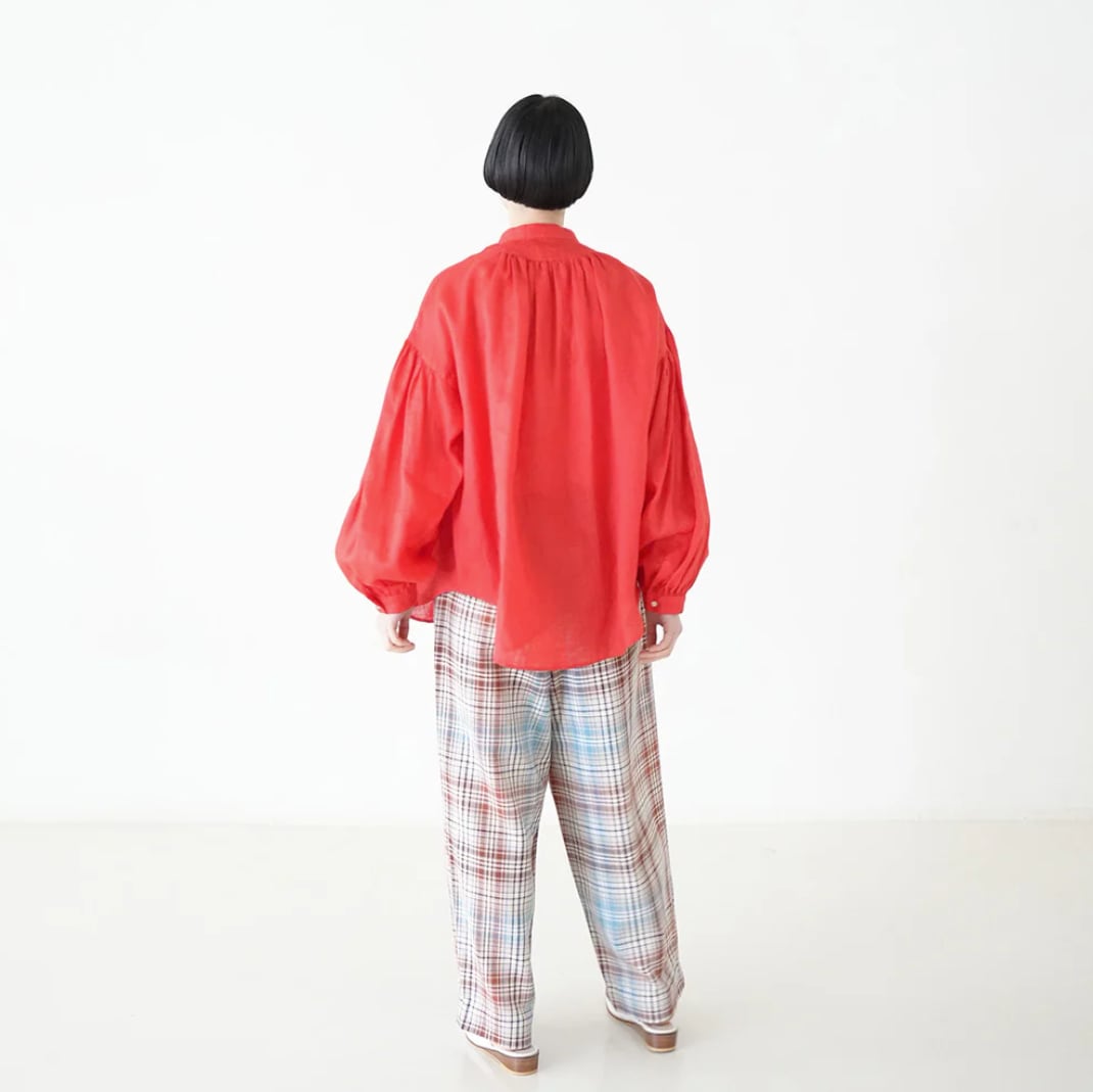 衿はバンドカラーで肩を落とし、衿周りから後ヨーク、袖口にたっぷりとギャザーを入れた柔らかな膨らみのあるMANON定番のアミカルシャツです。